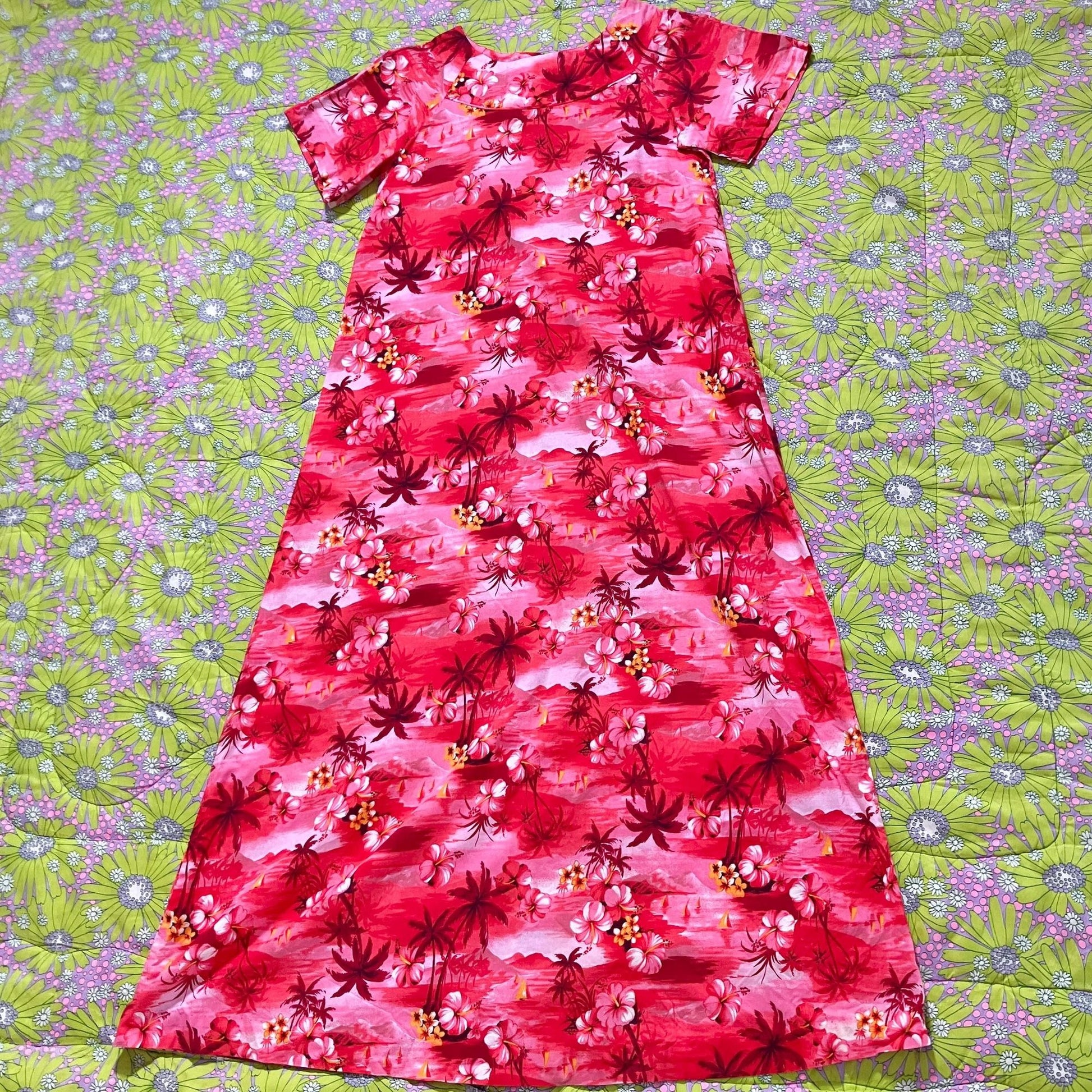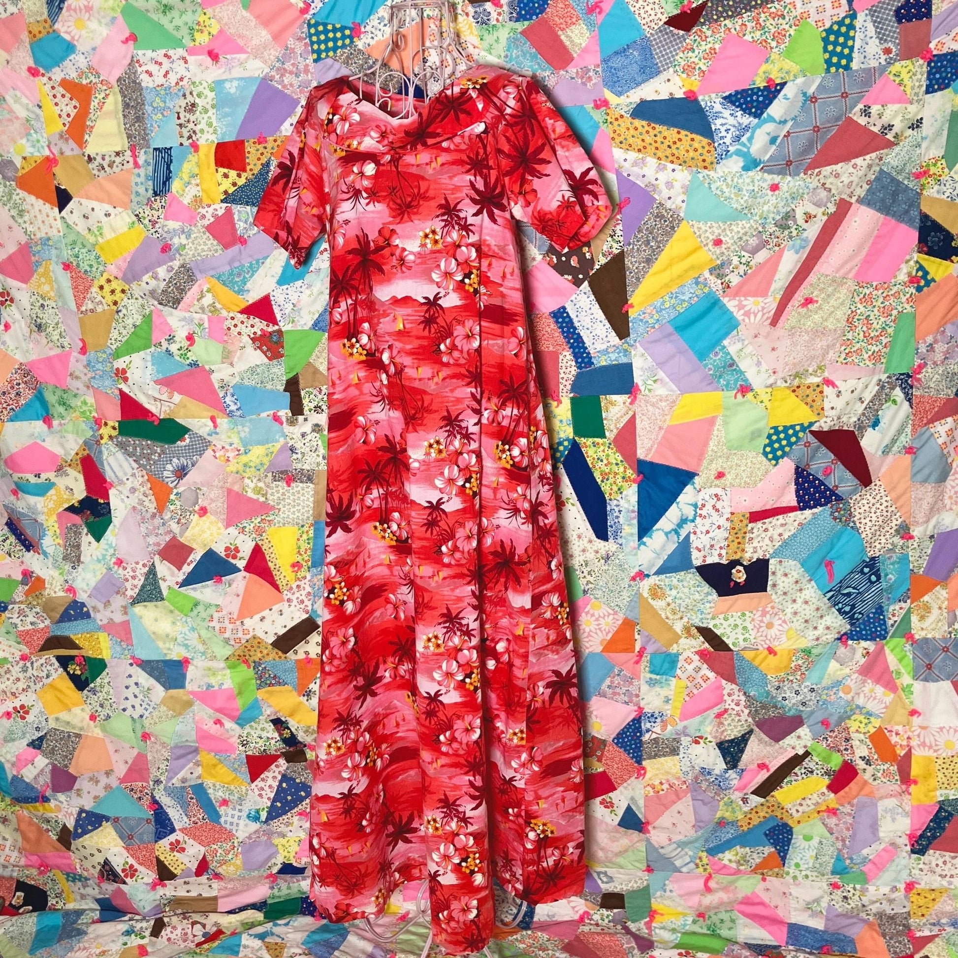 Vintage Hawaiian 70s dress. Bright red, coral pink, orange and white print of hibiscus, plumeria, palms, and an ocean landscape. 100% cotton, round yoke neckline with piping details, short sleevs, back zip closure, unlined, maxi length hem and a shift silhouette.