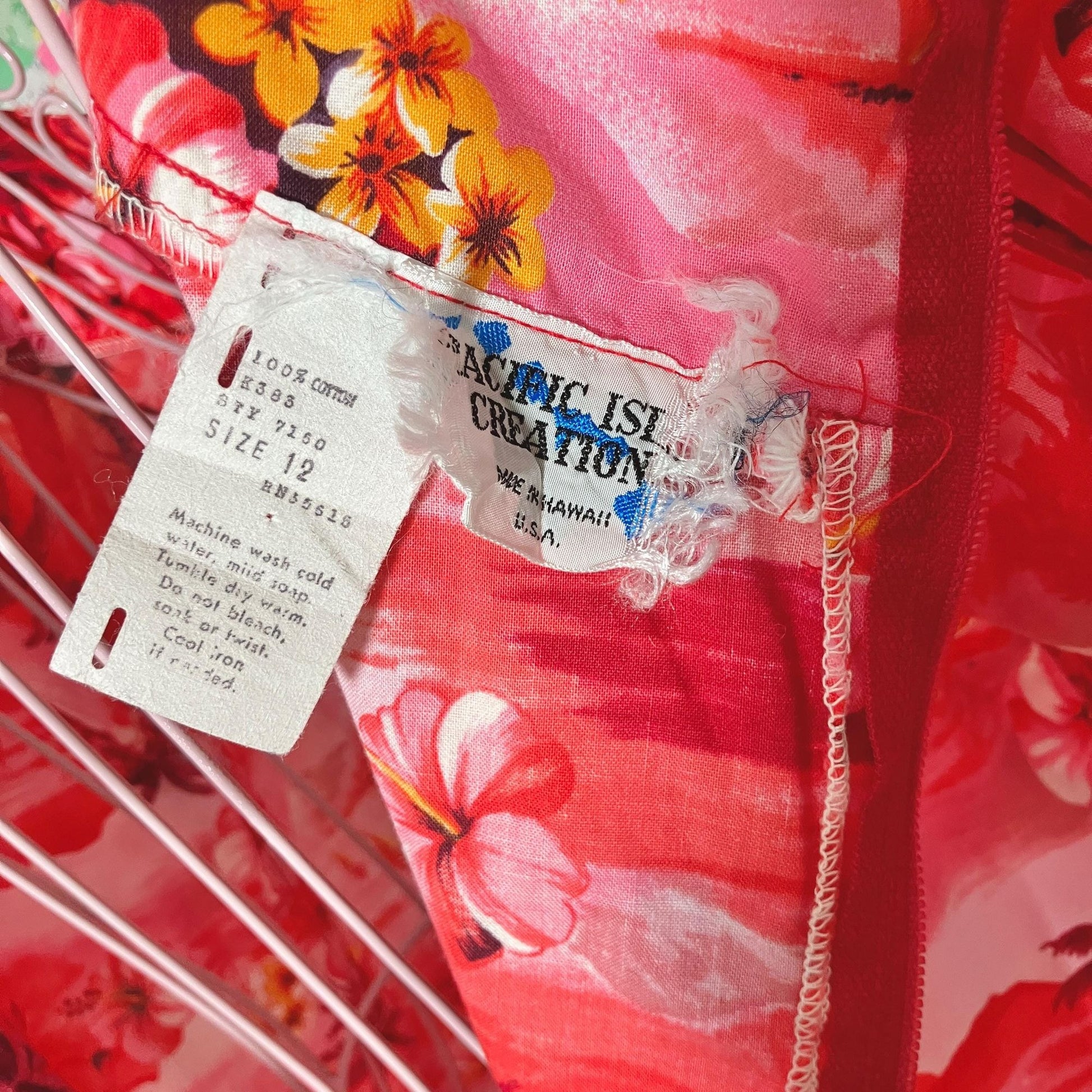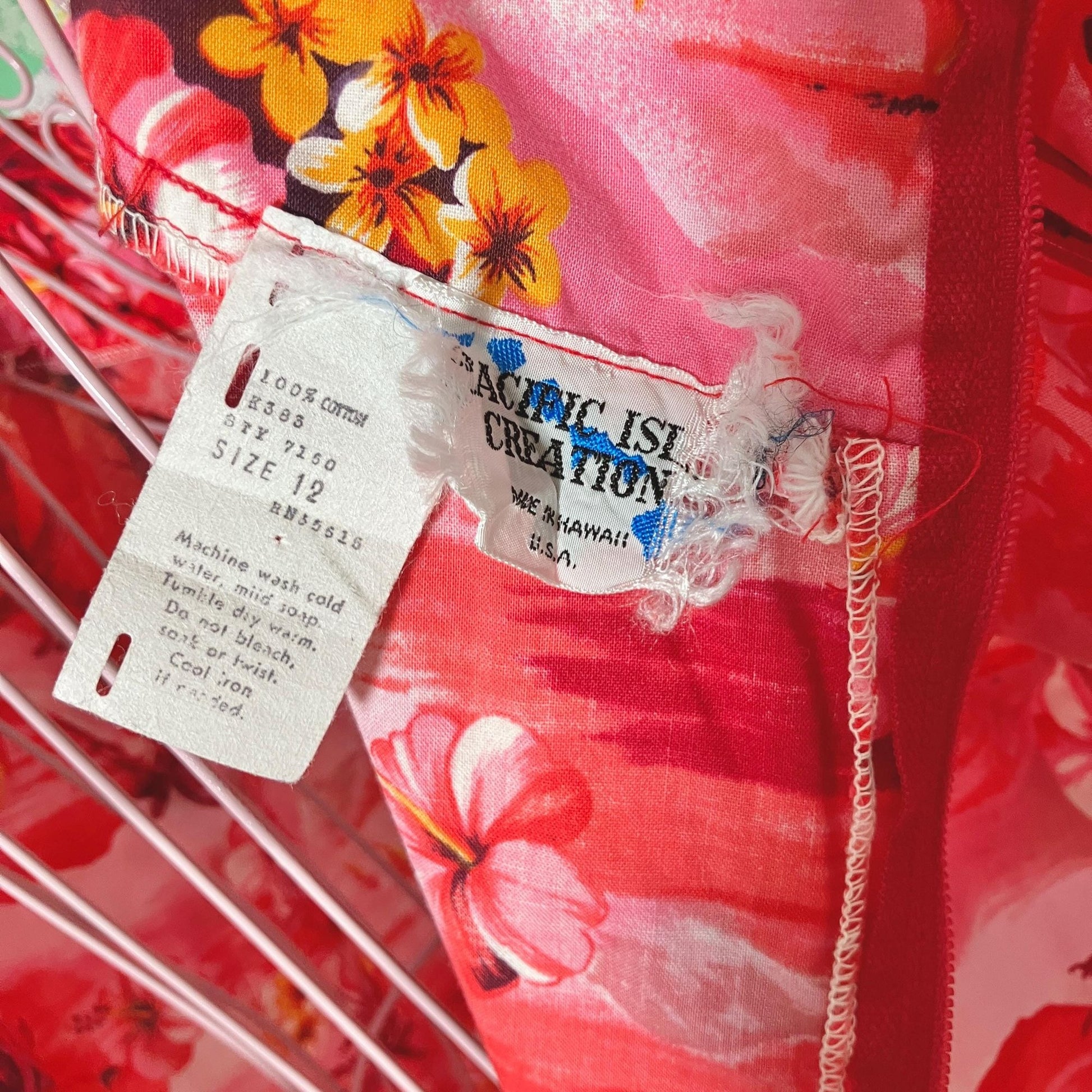 70s vintage dress | S-M | Hawaiian floral red white orange hibiscus plumeria palm made in Hawaii cotton Pacific Island Creations