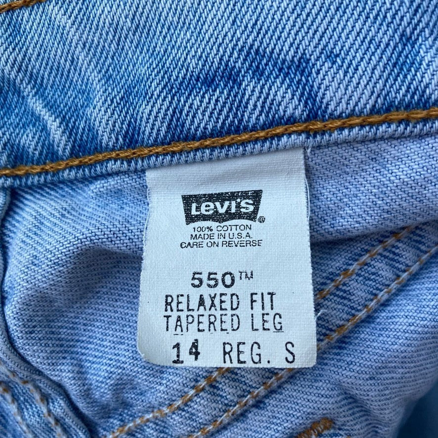 Levis 550 red tab vintage high waist mom jeans. Beautiful light wash. All cotton no stretch. Decade likely 90s. Would best fit a L-XL or 32-33, shorter inseam at 27.5 in but please see the measurements to ensure a perfect fit. Tag size is a 14 Reg S. Distressed condition with light wear and some staining, please see all photos. Here to help if you have any questions. Freshly laundered.