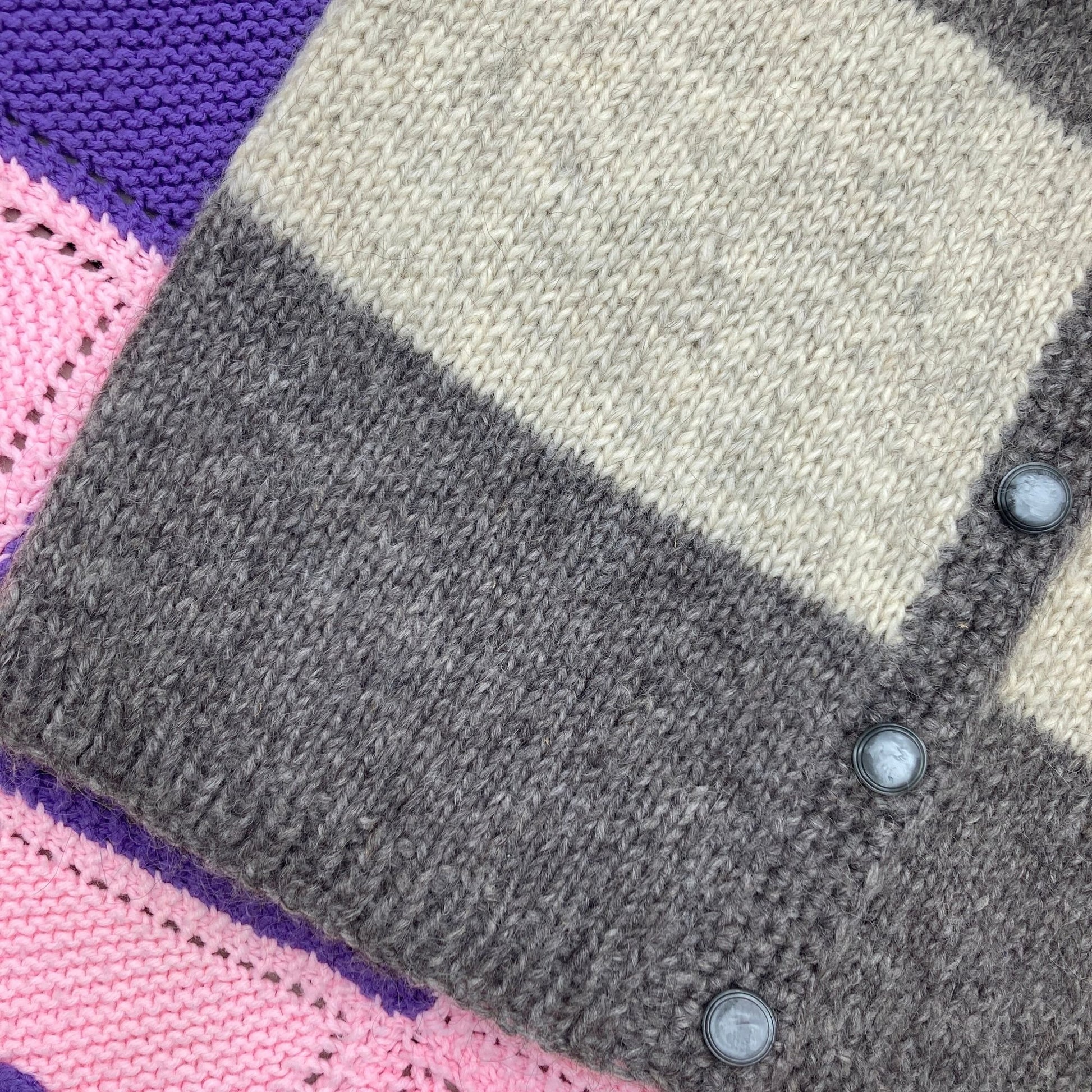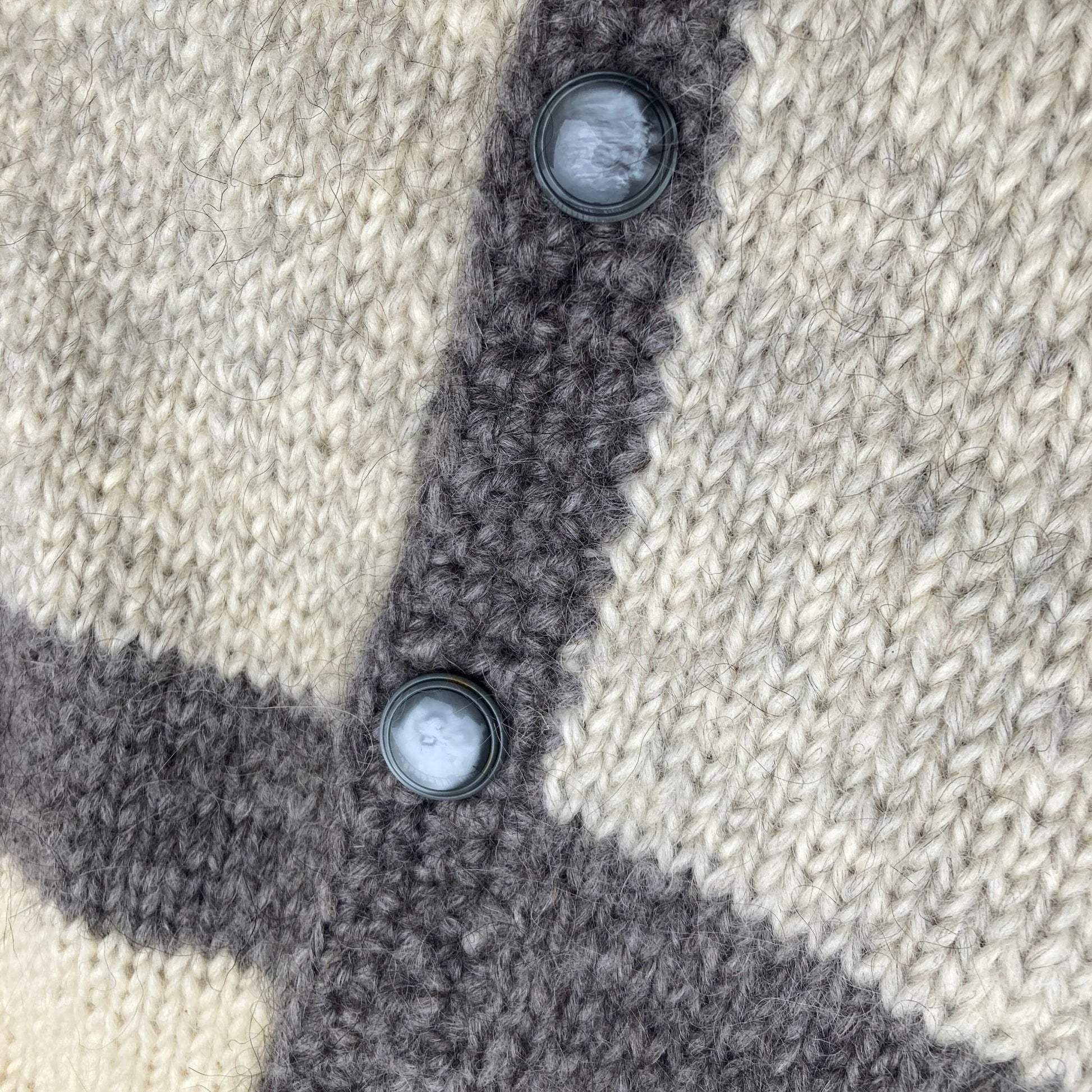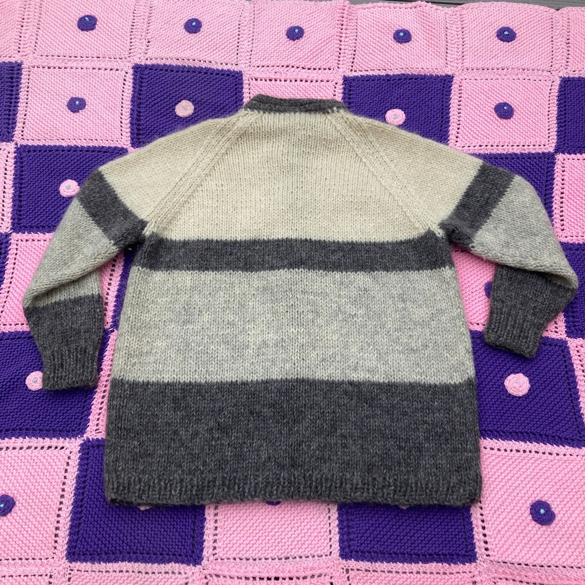 Vintage 60s 70s chunky wool cardigan . Block stripes in light and charcoal grey, button front closure and a crew neckline. Would fit best a S - M, but please see the measurements to ensure a perfect fit. Brand and original size are unknown, likely a one of a kind hand knit piece. Material estimated to be wool. Here to help if you have any questions.