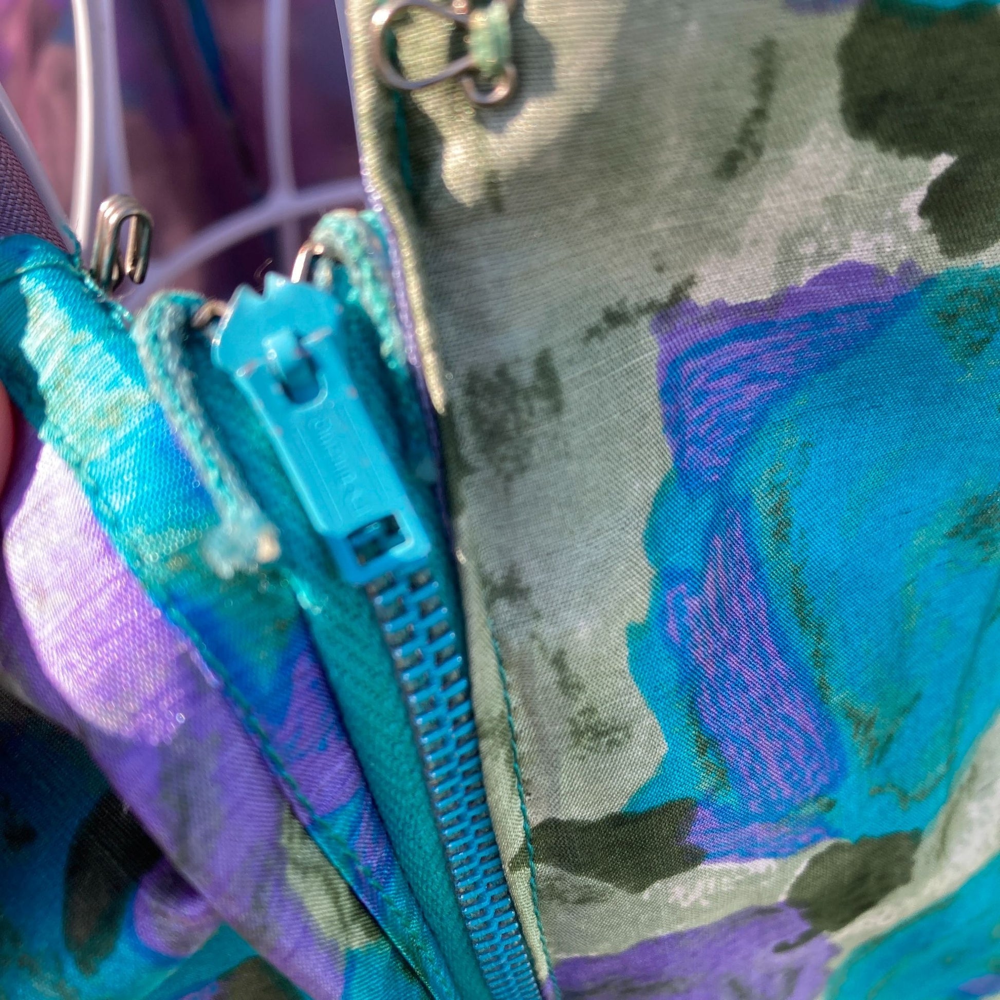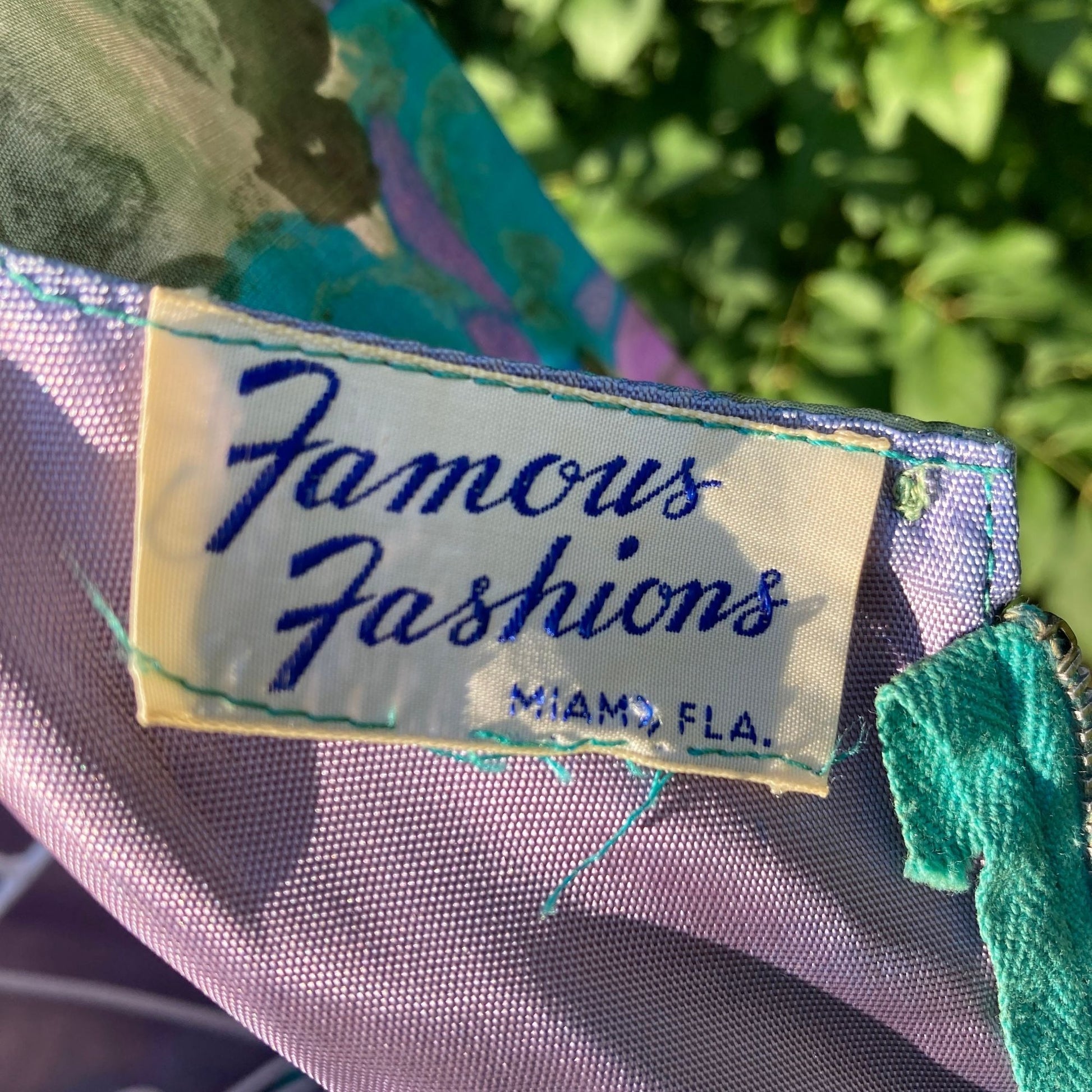 Vintage 60s dress. Green, grey, and purple floral print, back zip closure, scoop neckline, sheath silhouette, fully lined, pockets, spaghetti straps, and a below knee length hemline. Brand is Famous Fashions, original size, and material are unknown. Would best fit a S-M, but please check the measurements to ensure a perfect fit. Some minor pulls, please see the photos. Here to help if you have any questions.