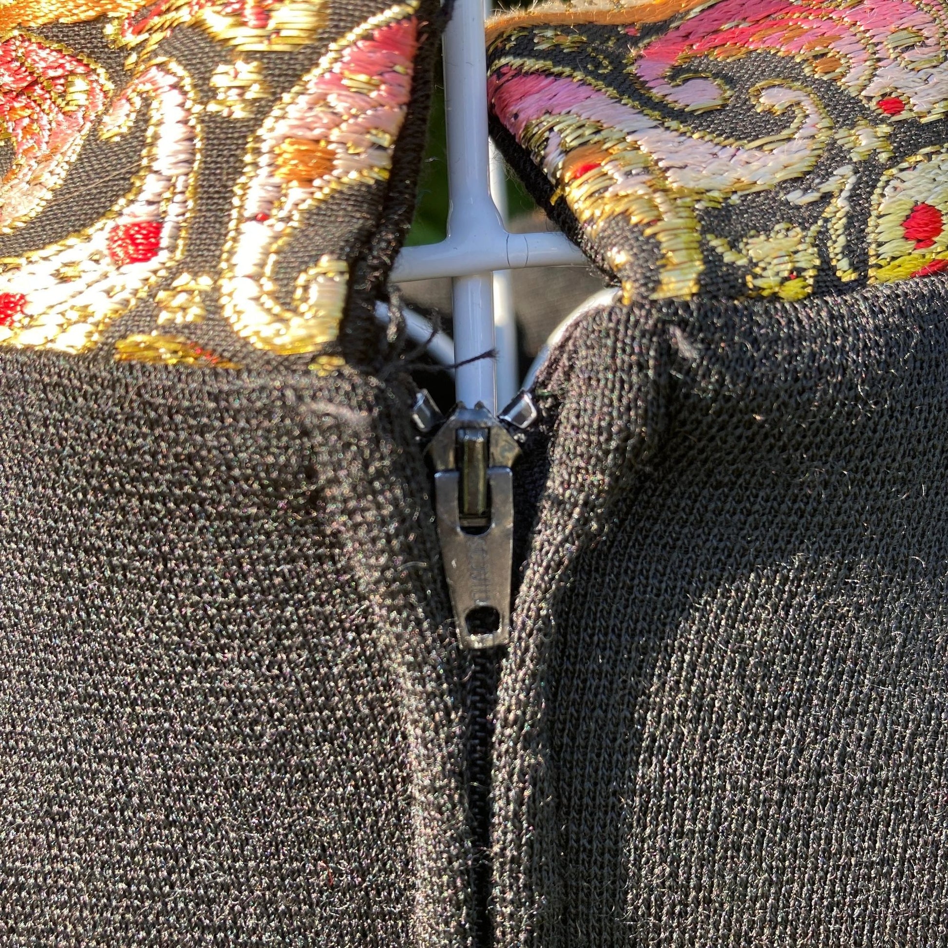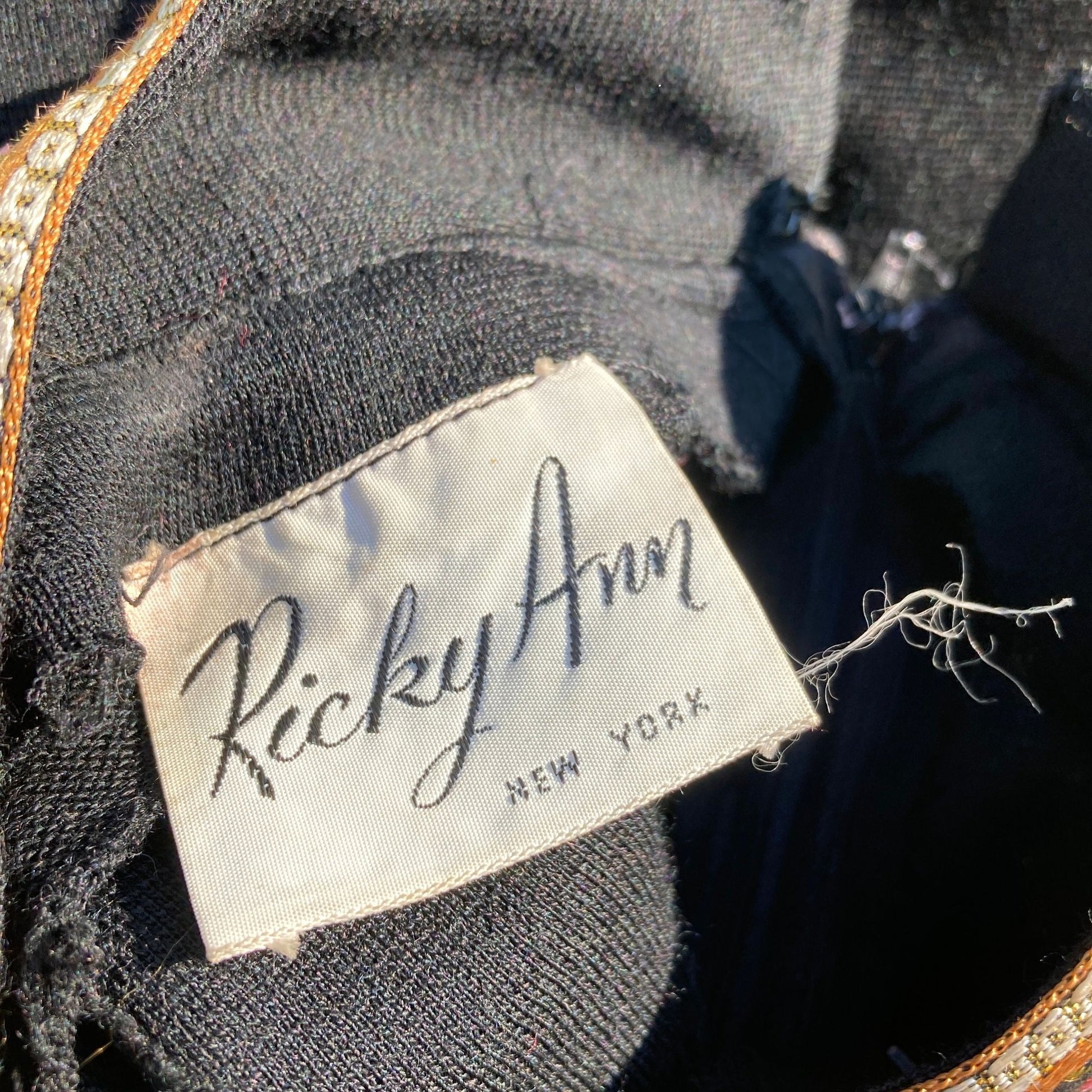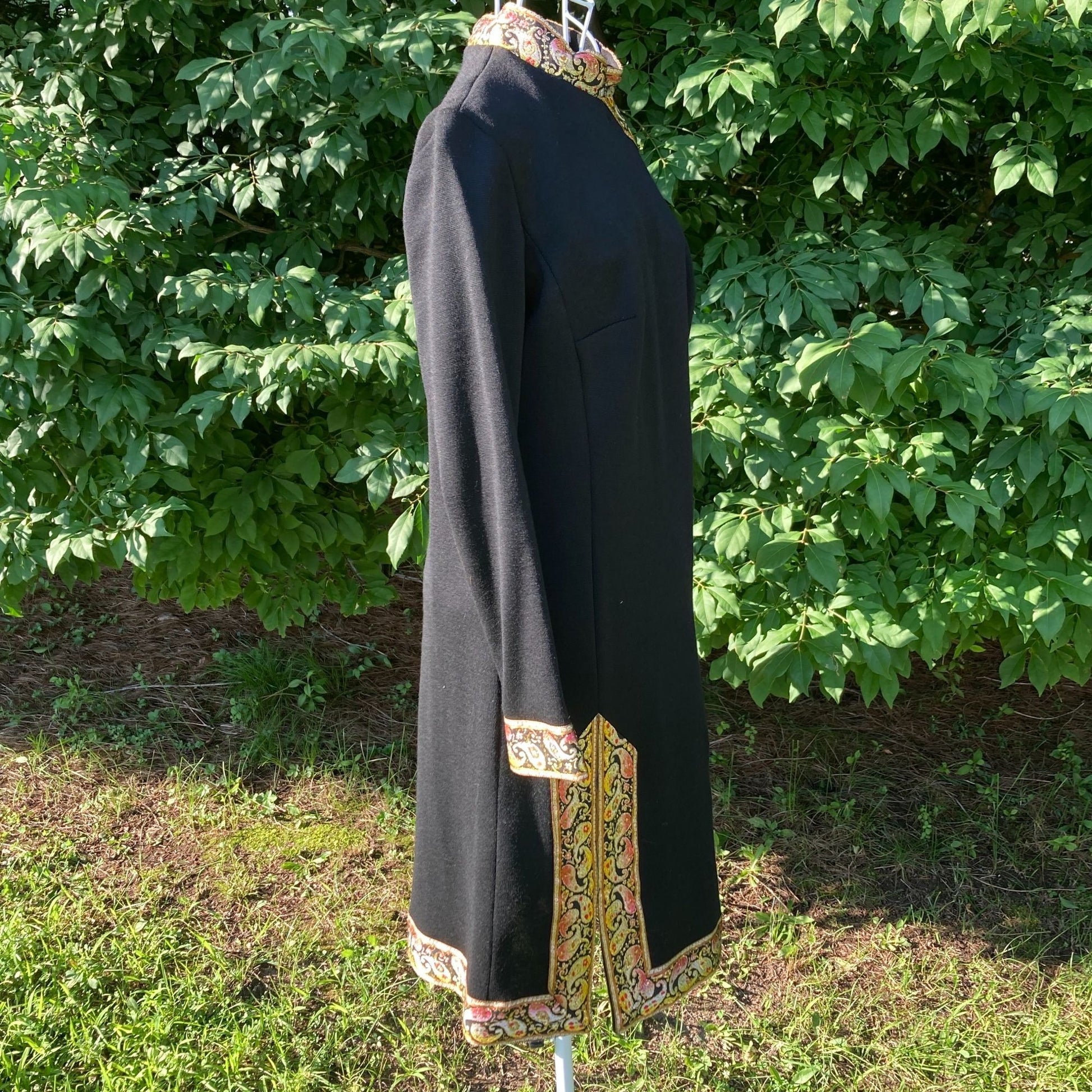 Vintage 60s dress. Black with gold trim details, back zip closure, mock neckline, shift silhouette and a knee length hemline. Brand is Ricky Ann New York, original size and material are unknown. Would best fit a S-M, but please check the measurements to ensure a perfect fit. Material estimated to be wool or a wool blend. Small pull, please see the photos. Here to help if you have any questions.