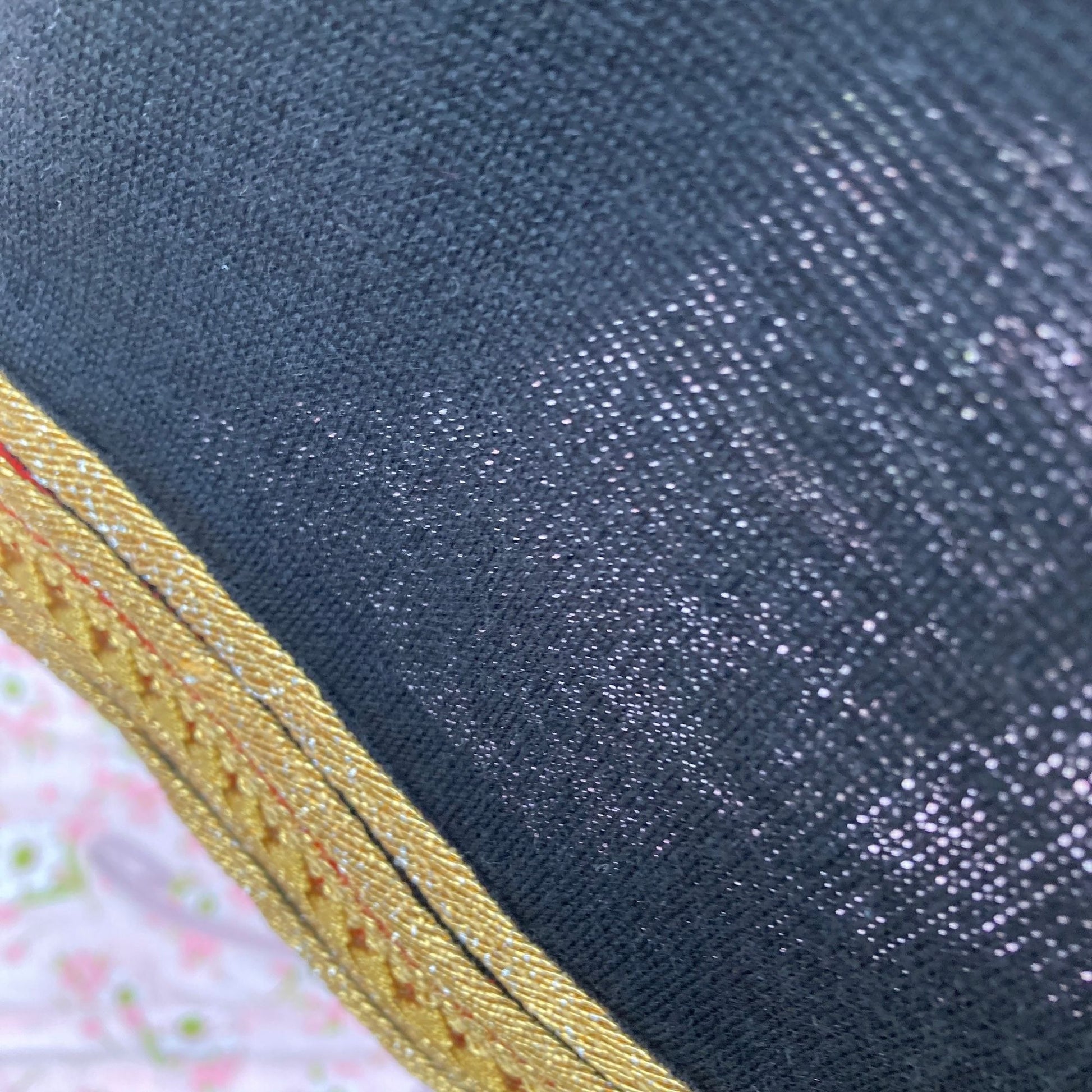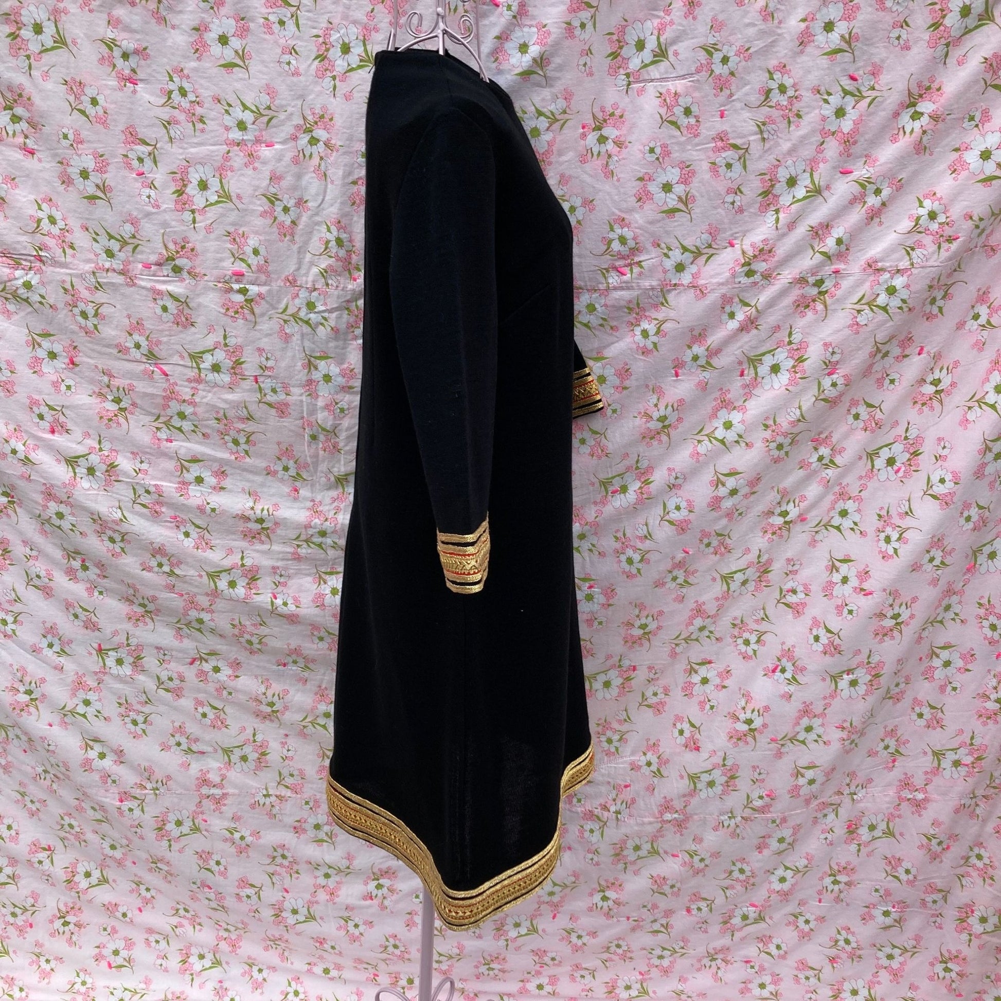Black with gold trim details, back zip closure, crew neckline, shift silhouette, 3/4 length sleeves, and a knee length hemline. Brand is designed by Felicia, original size is a 14, and material is unknown.