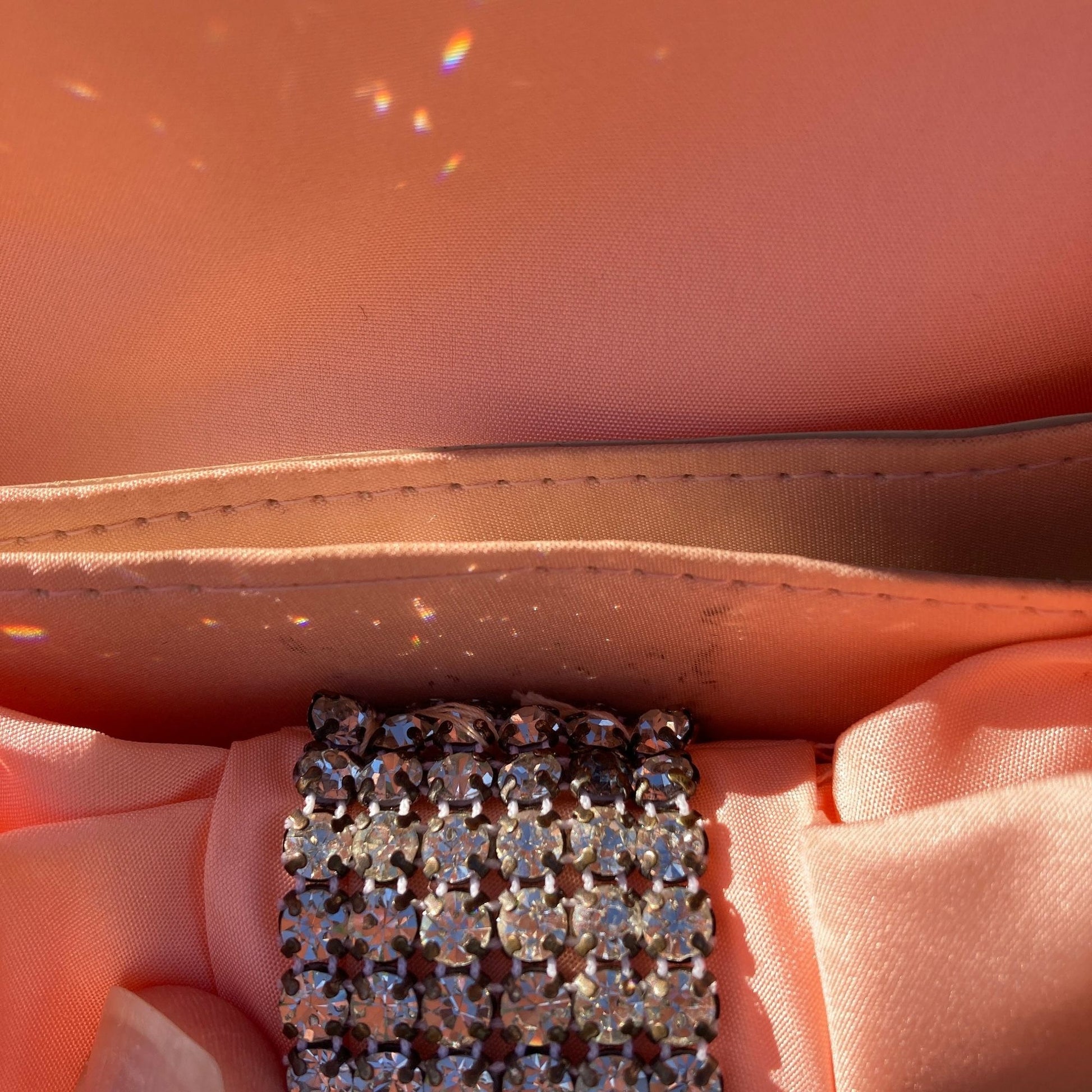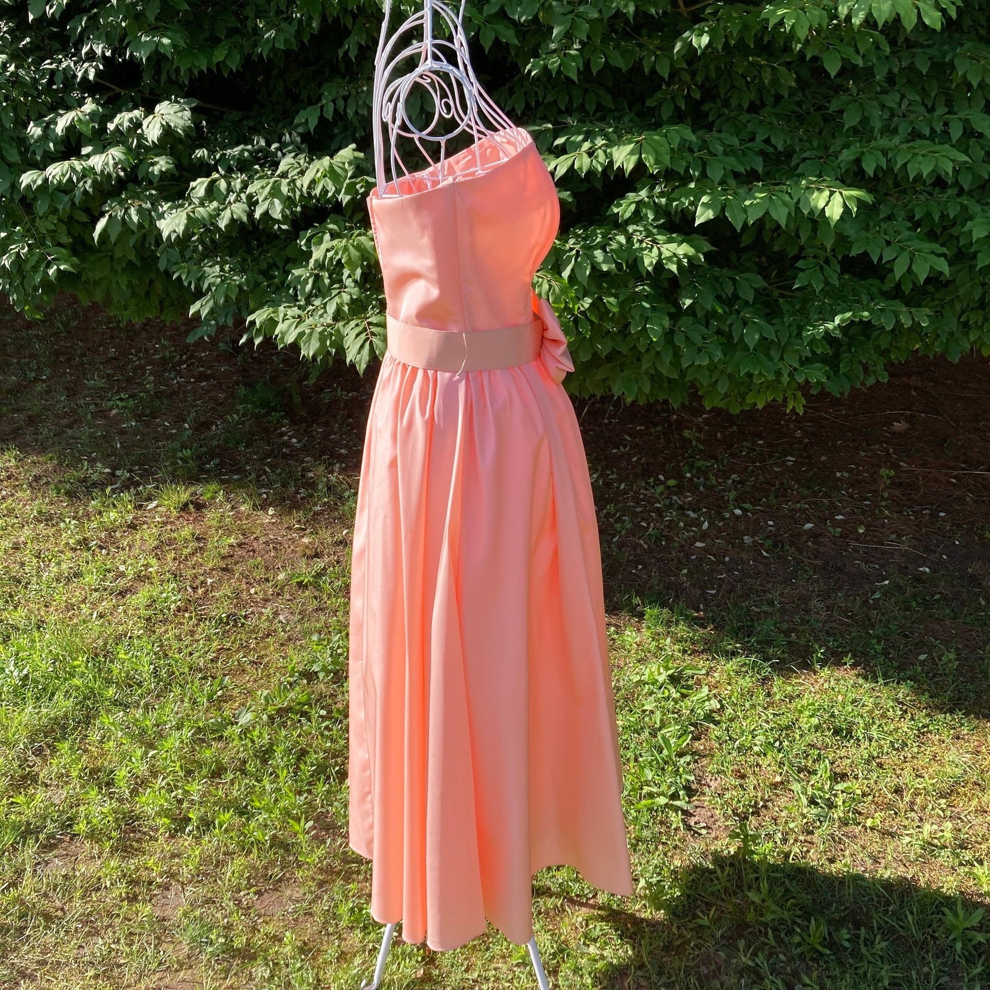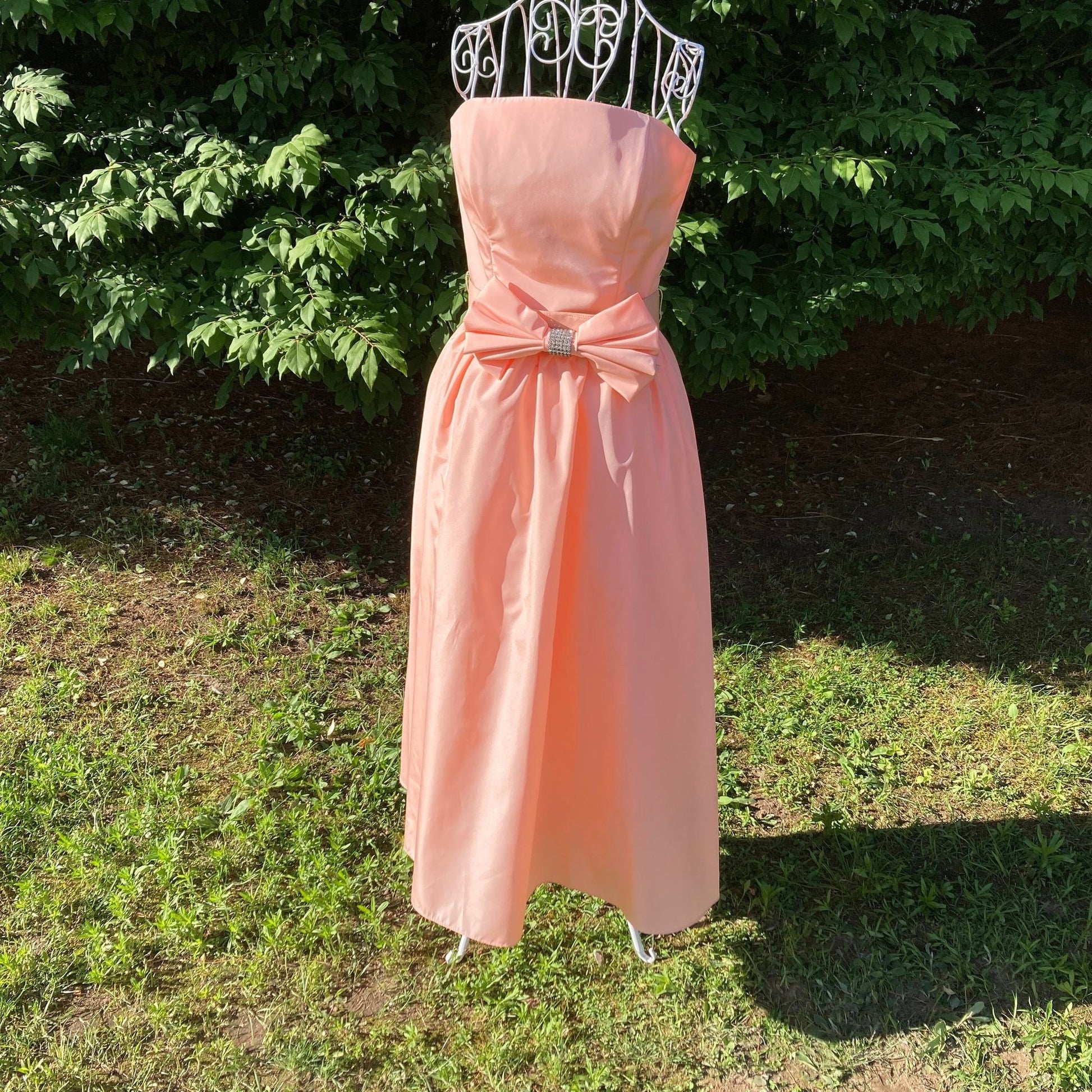 Vintage 70s 80s peache dress. Strapless bodice with and a matching bow with rhinestones. Back zip closure and a midi length hem. Would best fit a S-M, but please see the measurements to ensure a perfect fit. Brand is Patangis, material is unknown, and tag size is 7/8, and ILGWU Union made in the USA. Some faint stains, please see the photos. Here to help if you have any questions.