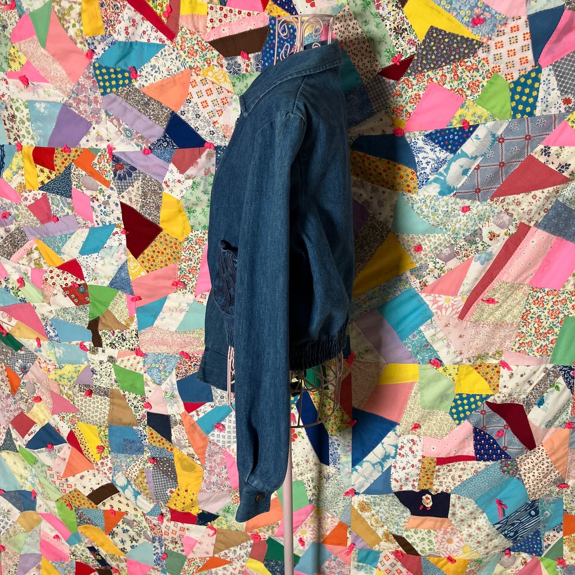 Vintage 70s jean jacket. Super pretty medium wash, front metal zip closure, elastic at the bottom of the hem, and a single front patch pocket. Cute criss cross detail on the top of shoulder and pocket. Some fades along the top of shoulders/ sleeve and collar, please see the photos. Tag size is a 13/14, brand is The Allies and material is a cotton polyester blend. Would fit a S - M, please check the measurements to ensure a perfect fit. Freshly laundered. Here to help if you have any questions.