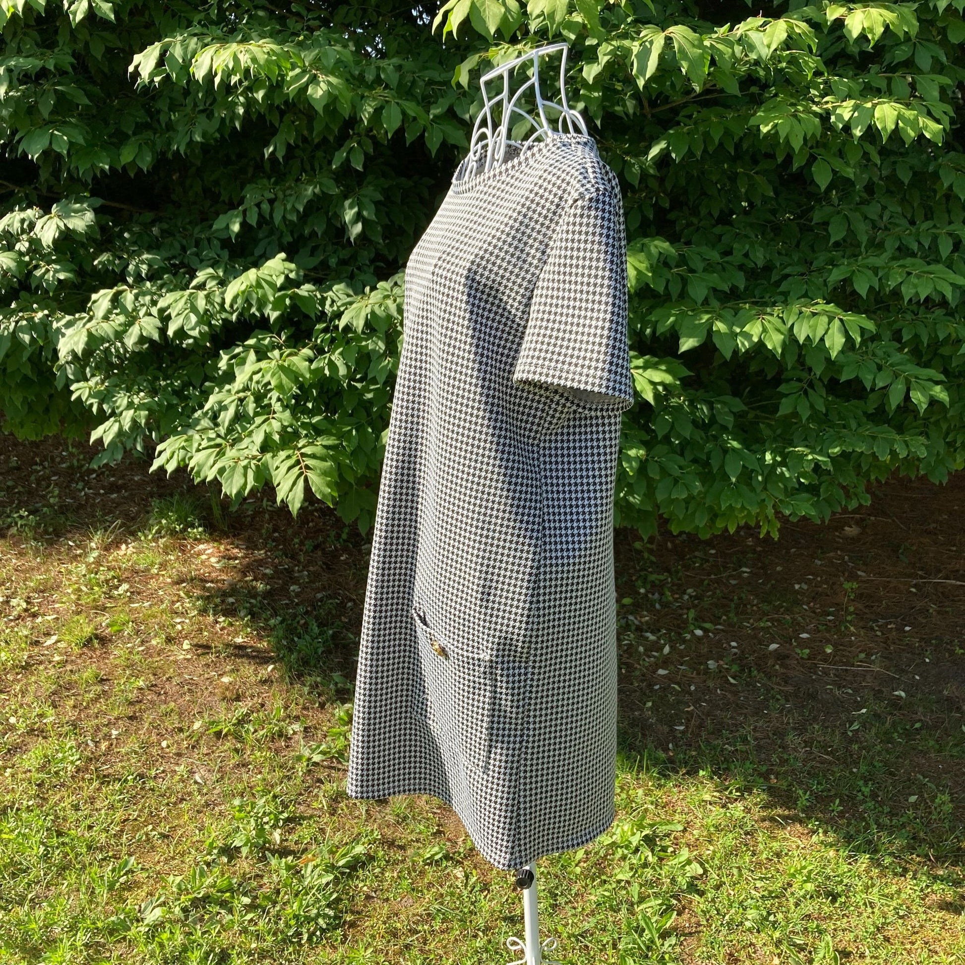 Black and white houndstooth vintage 70s dress. Cute front patch pockets, gold tone details, short sleeves, and a shift silhouette. Unlined. Pull over with no closure . In excellent vintage condition. Would best fit a S- M, but please see the measurements to ensure a perfect fit. Freshly laundered. Here to help if you have any questions.