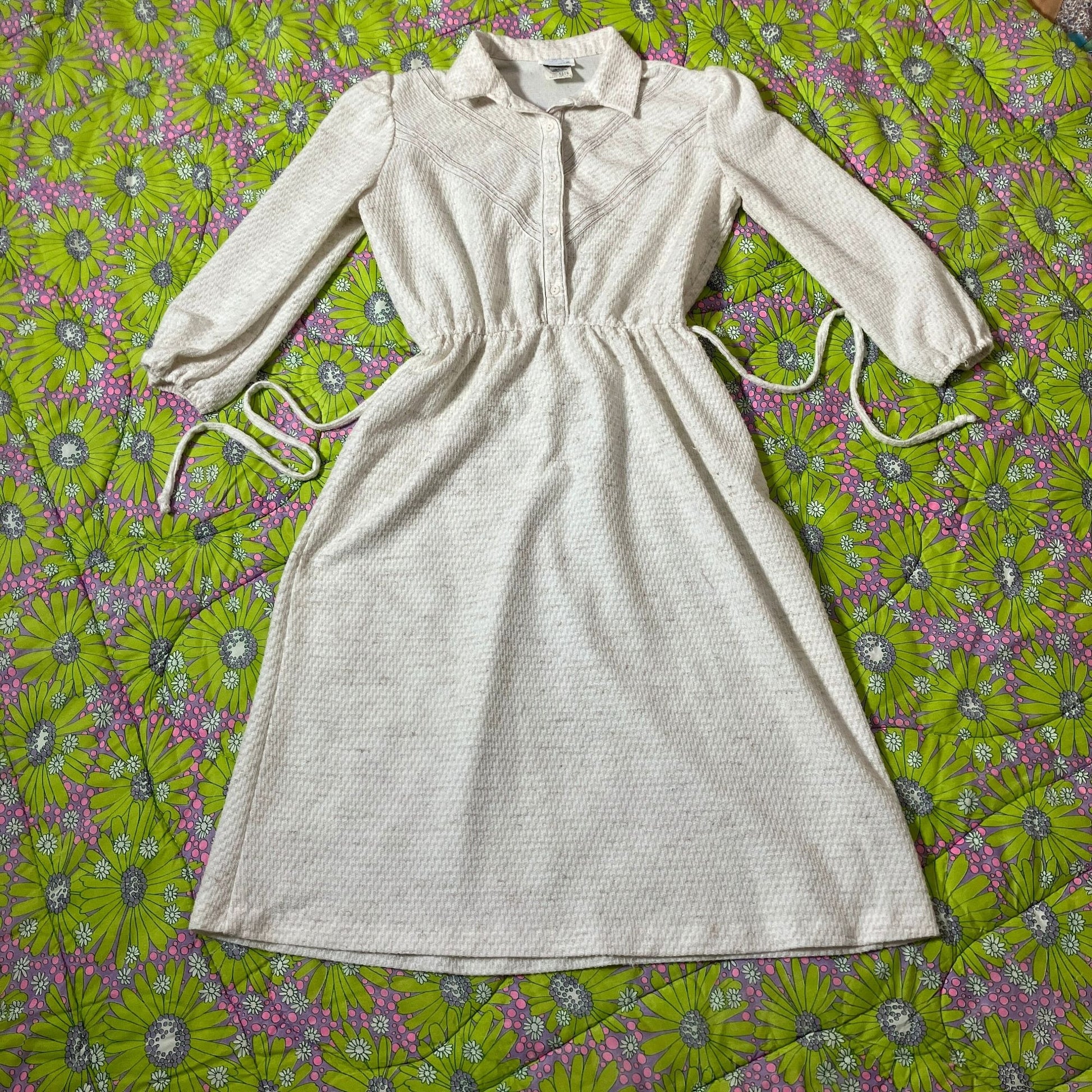 vintage 70s dress off white 1970s 1980s | XS-S | secretary textured Aygee ilgwu union made flax poly blend