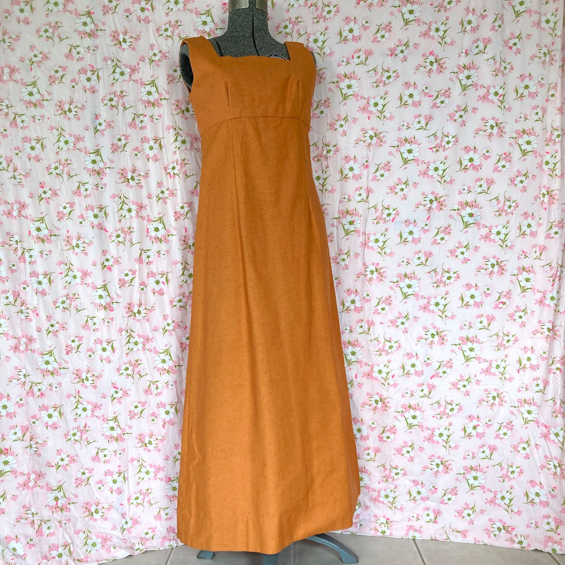 Burnt orange 70s vintage hand made dress. Gorgeous textured material, long olive green velvet bow. Sleeveless with an empire waist maxi silhouette, unlined, square neckline, and back zip closure. Would best fit a S - M, but please see the measurements to ensure a perfect fit. Here to help if you have any questions.
