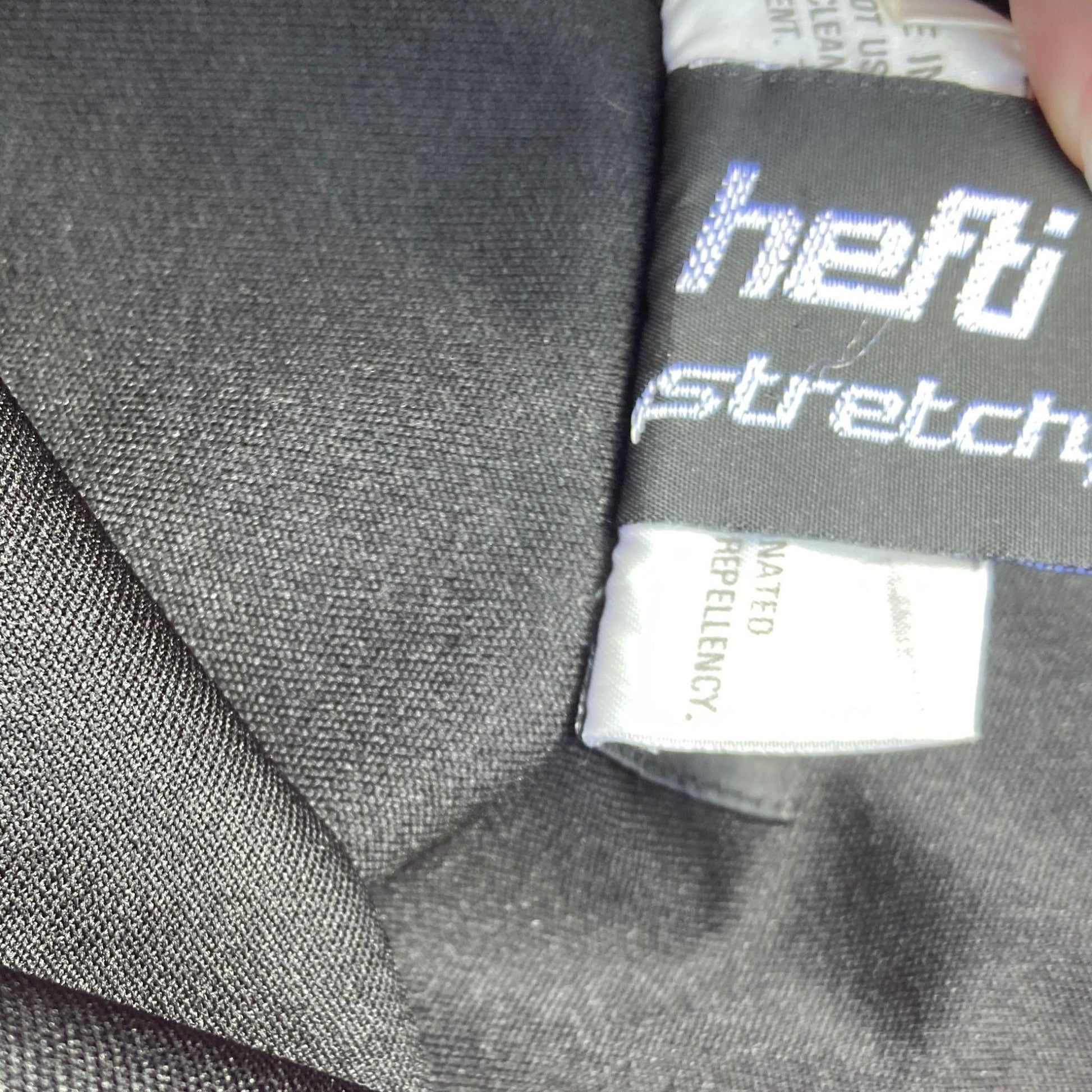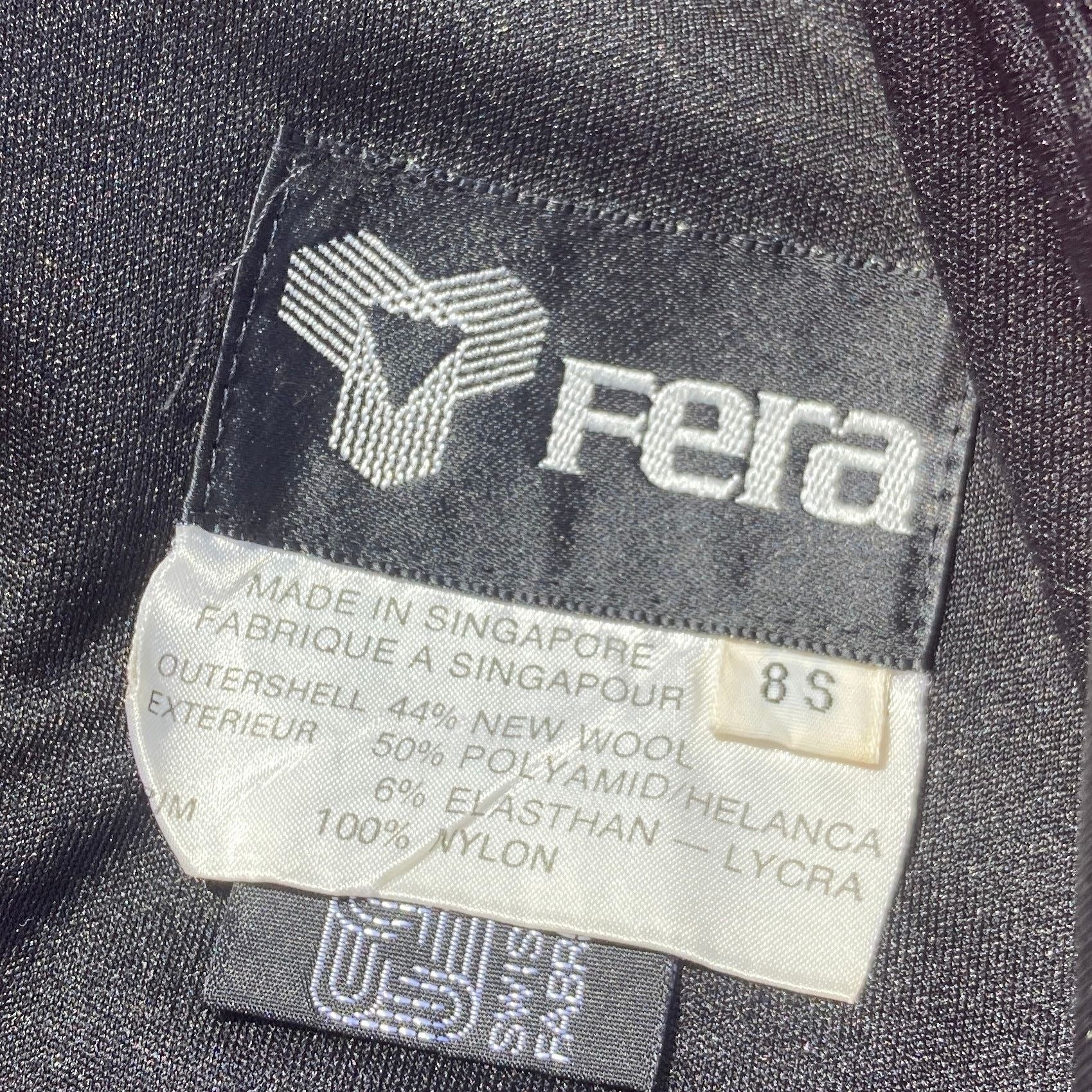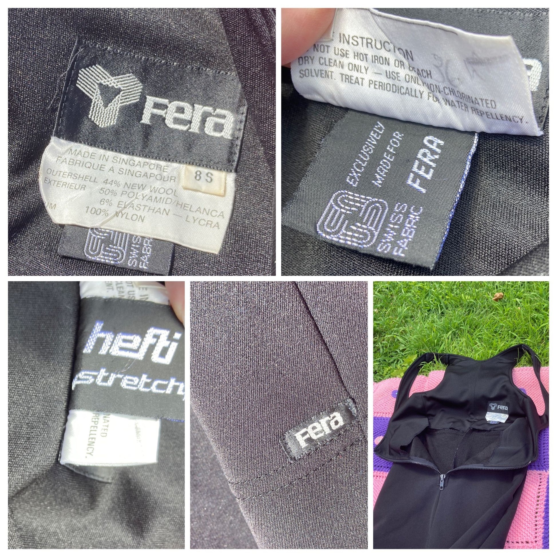 Vintage 70s black ski pant jumpsuit. Brand is Fera, material is wool, polyamide, nylon and elastane blend, tagged a size 8 S. Shorter inseam at 26". Lined from the mid calf down with a stirrup for your foot. Please see the measurements to ensure a perfect fit.