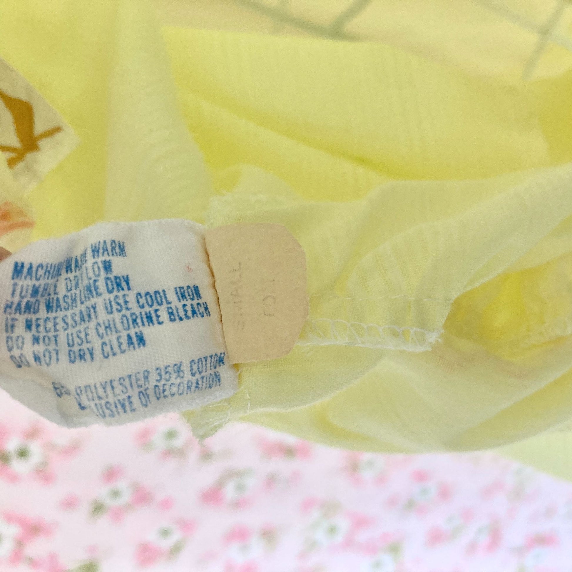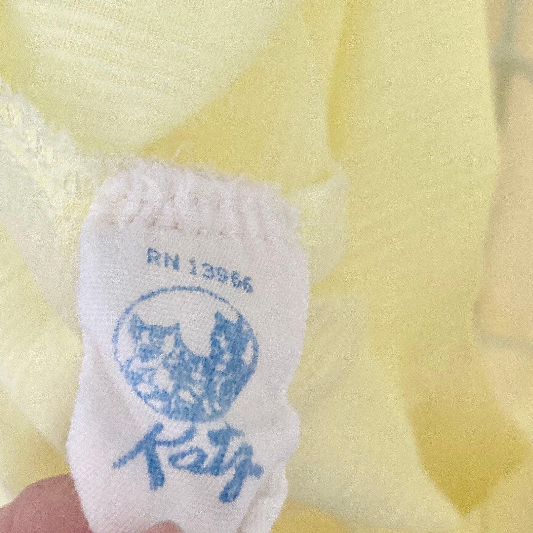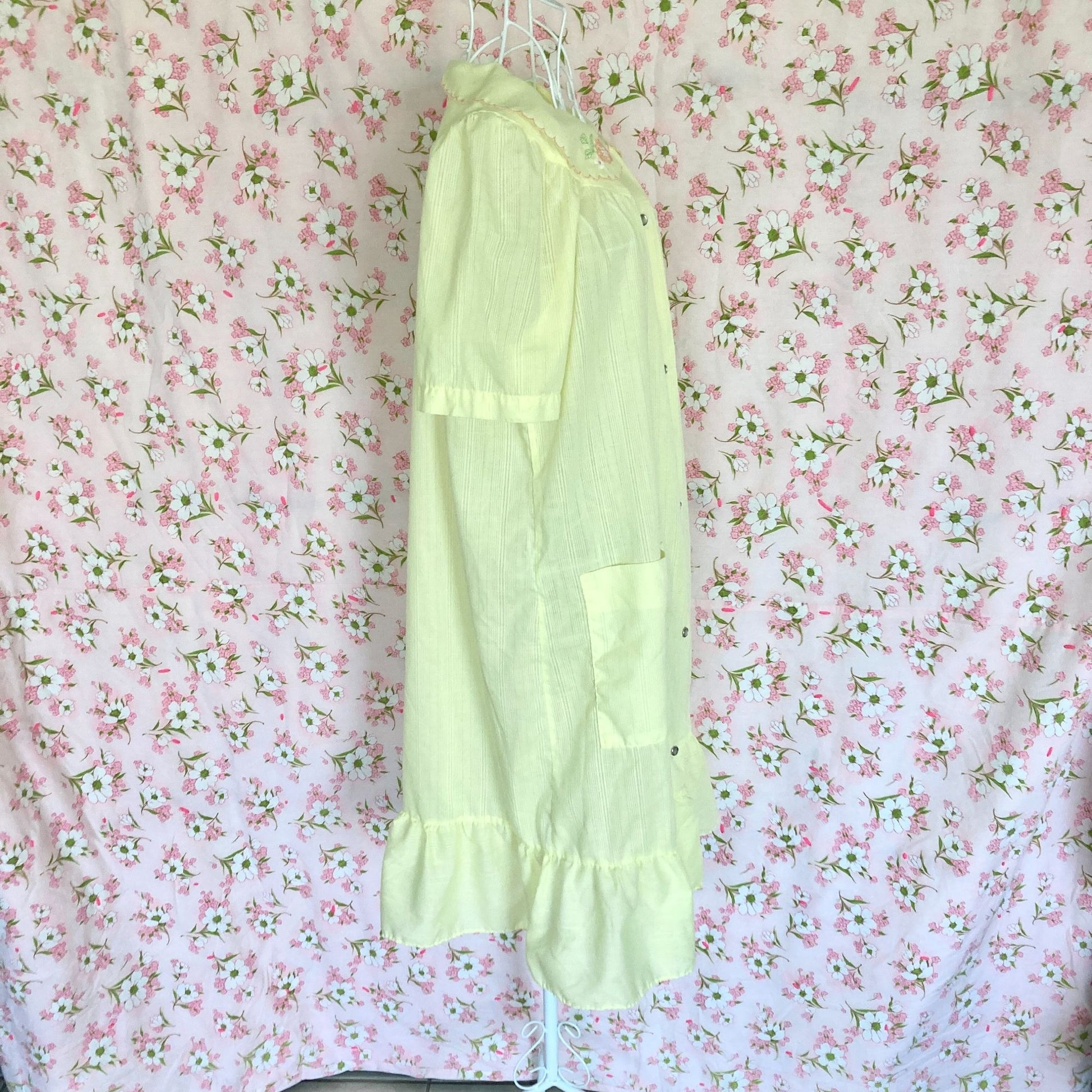 Vintage 70s house dress. Pretty pastel yellow color, pink floral embroidery on the collar, front snap closure, collared neckline, single front patch pocket, ruffle detail, and a below the knee hemline. Brand is Katz, original size is S, and material is a polyester and cotton blend. Would best fit a S-M, but please check the measurements to ensure a perfect fit. Freshly laundered. Here to help if you have any questions.