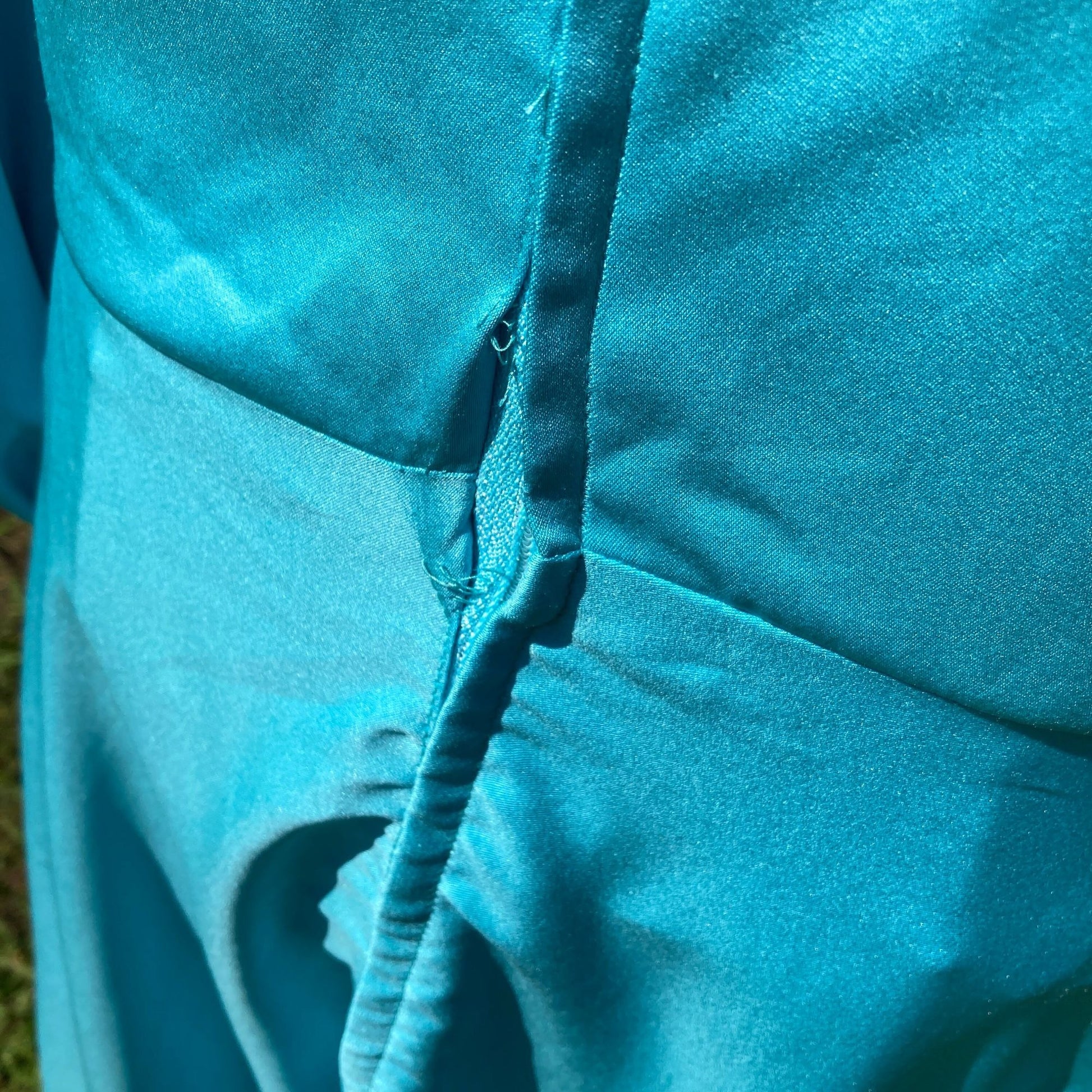 Romantic 1970s dress. Pretty pastel teal / blue color. Delicate overlaid lace material on the bodice and arm openings, lace up v neckline, and a maxi length hem. Would best fit a S-M, but please see the measurements to ensure a perfect fit. Zip up arm openings. Some wear on the lace up string, small stain on the zipper, and small pulls and areas of pilling, please see the photos. Brand, material, and original size are unknown. Freshly laundered. Here to help if you have any questions.