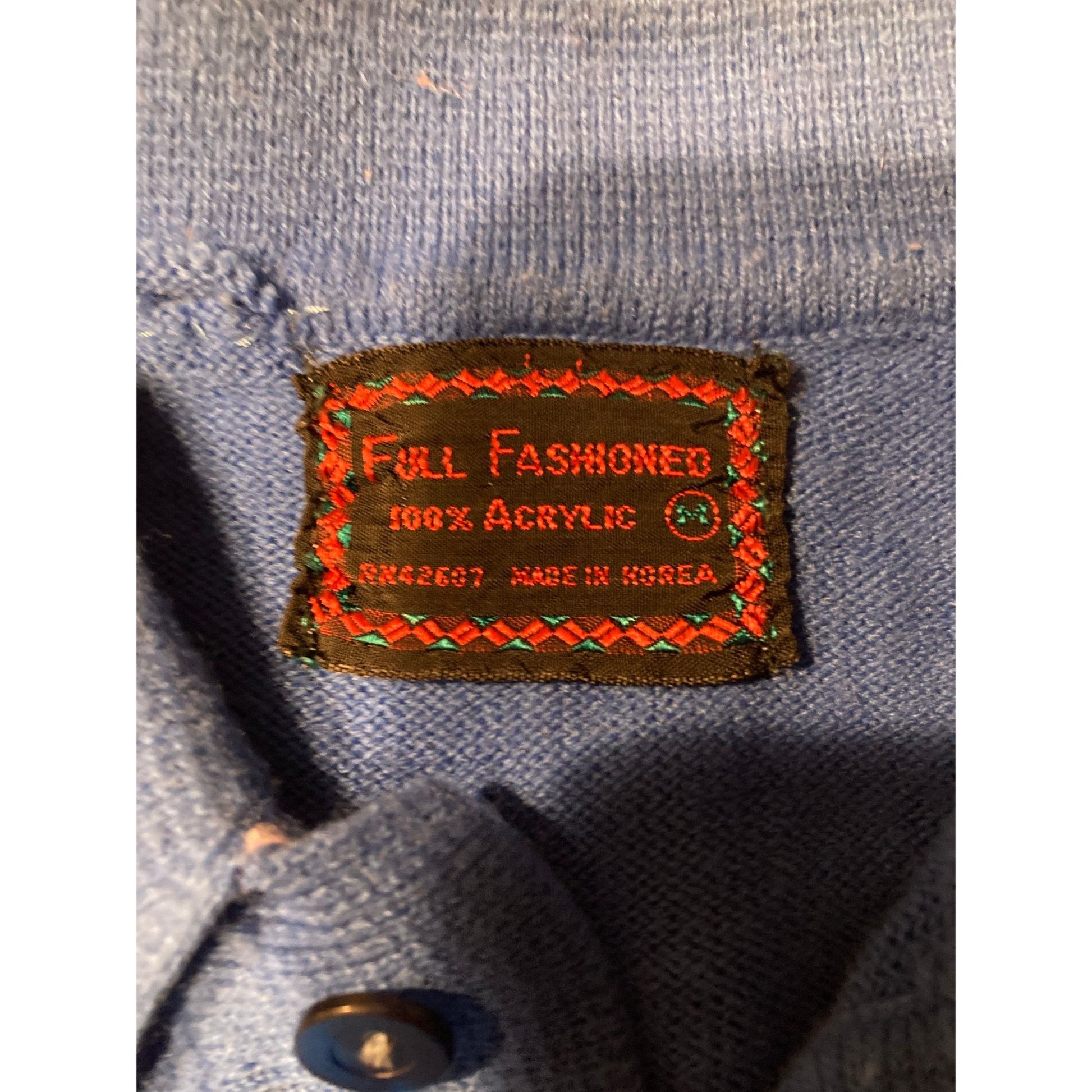 Short sleeve vintage 70s sweater. Pretty cobalt blue, short sleeves, collared neckline, and a white detailing. Would fit best a S - M, but please see the measurements to ensure a perfect fit. Excellent vintage condition besides some light pilling, please see the photos. Tag size is a M, brand is Full Fashioned, and material is acrylic. Freshly laundered. Here to help if you have any questions.