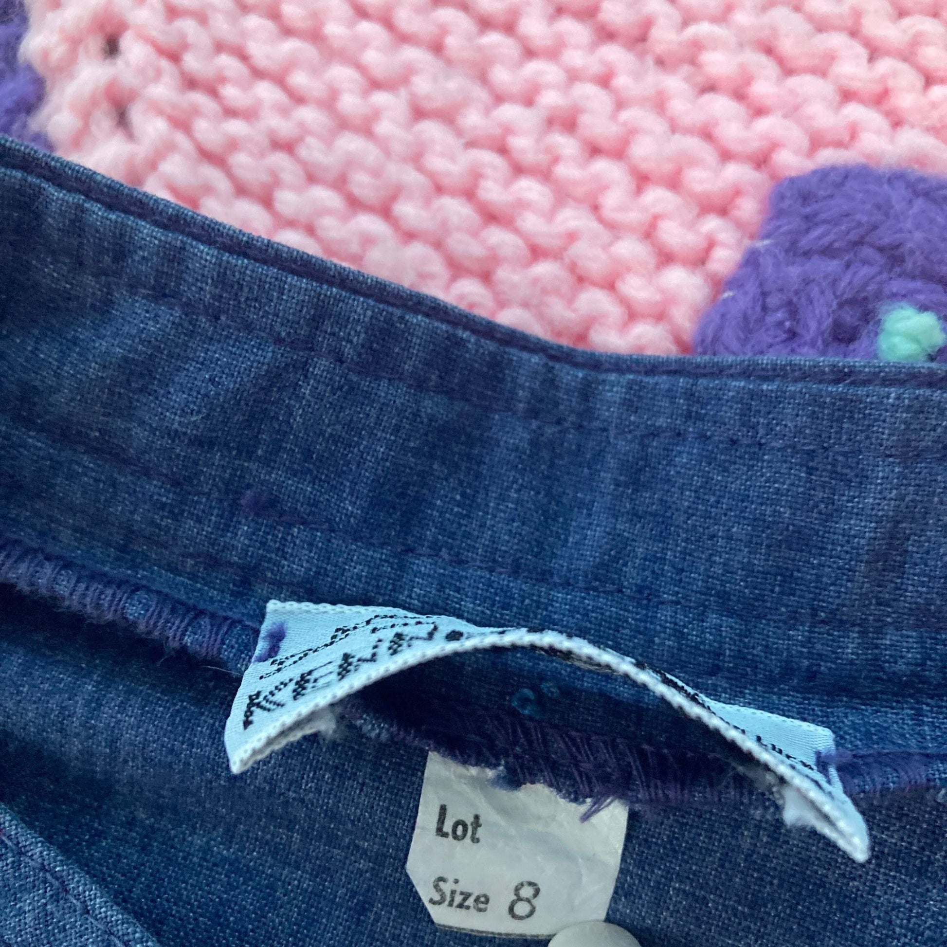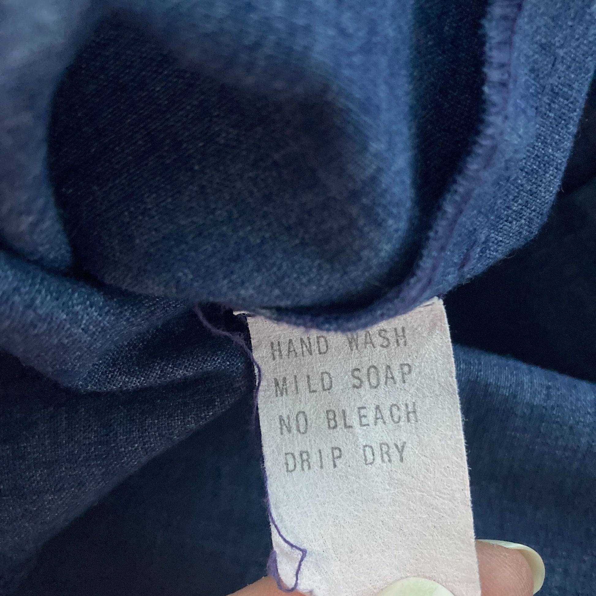 Chambray jean tunic blouse. Front patch pockets, button front closure, and a crew neck line . Decade likely 70s . Would fit best a S - M, but please check the measurements to ensure a perfect. Material is unknown, tag size is an 8, and brand is Deborah for Kenneth Greene. Comes with a sash belt might be for neckline as there is a belt loop there, not sure though! Here to help if you have any questions. Freshly laundered.