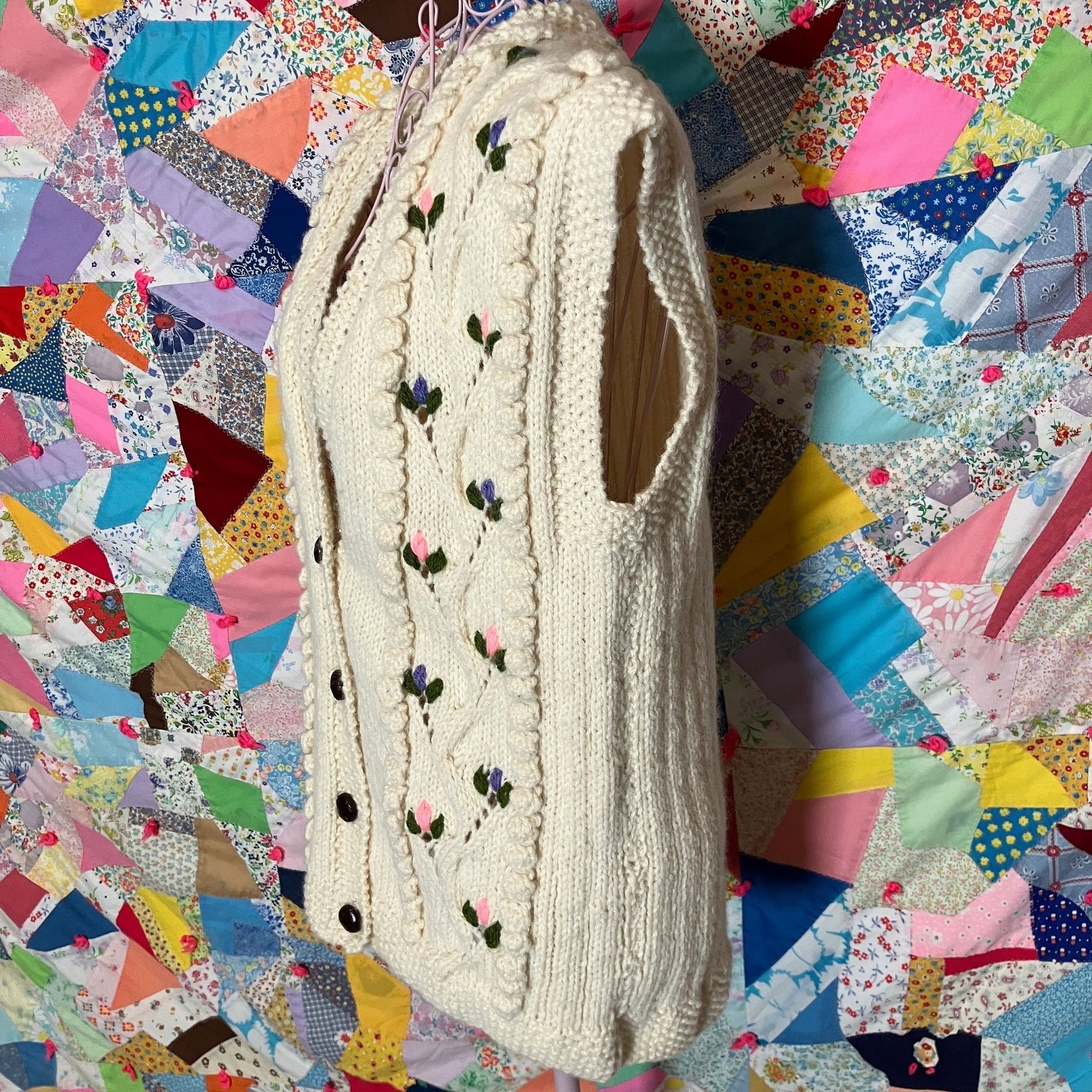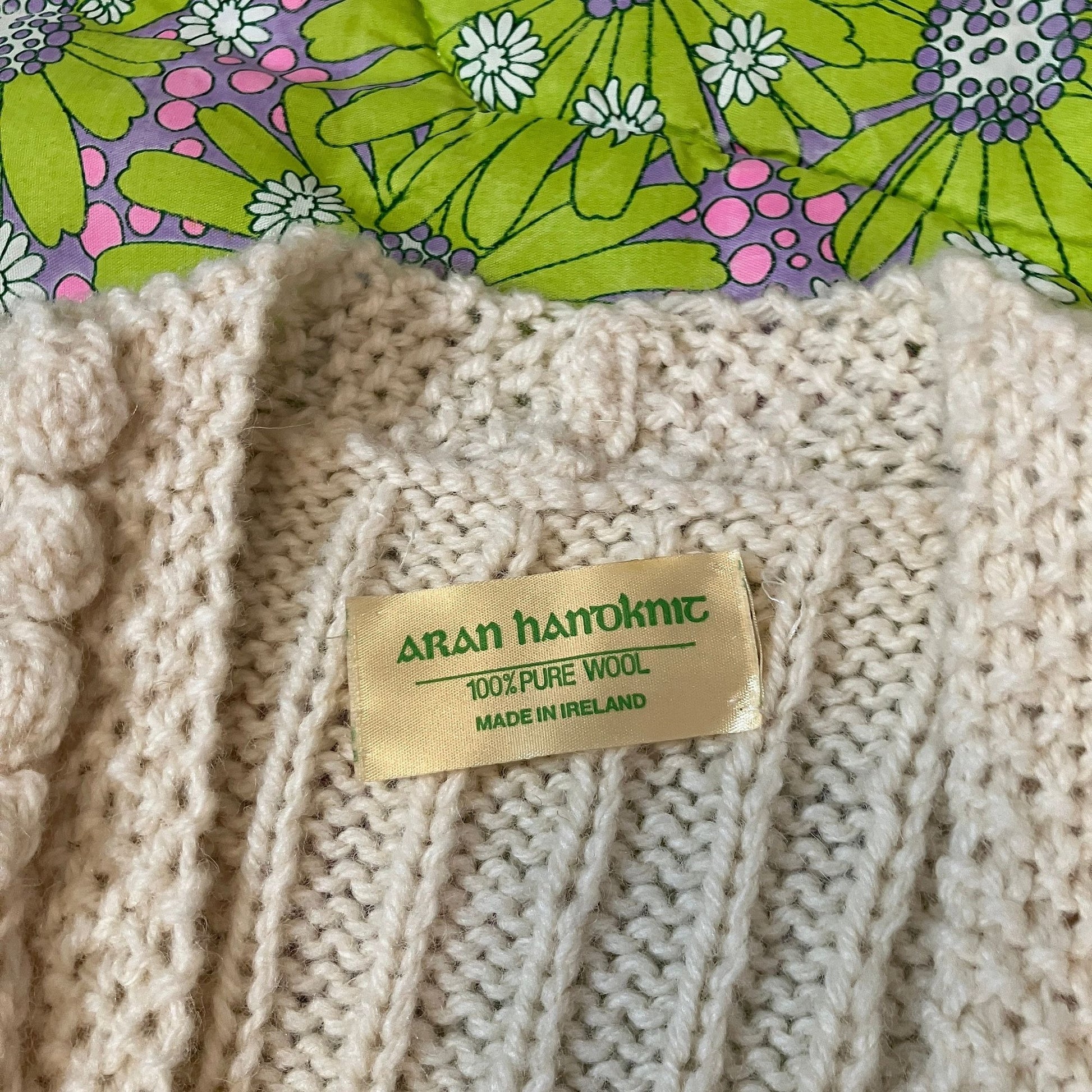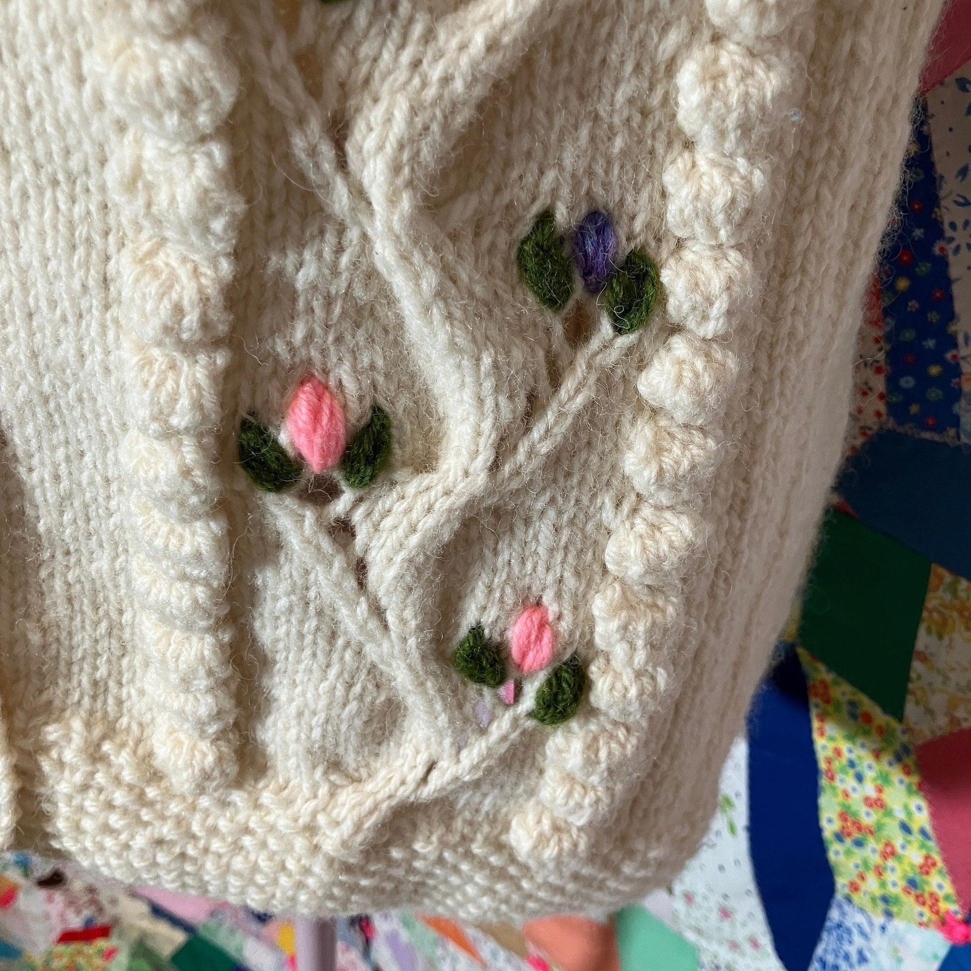 Vintage Aran Handknit 70s oat 100% wool cardigan sweater vest . Chunky cable knit / fisherman design with pink and purple flowers, v neck and a button front closure. Made in Ireland. In great vintage condition besides tag is only sewn on one corner, please see the photos