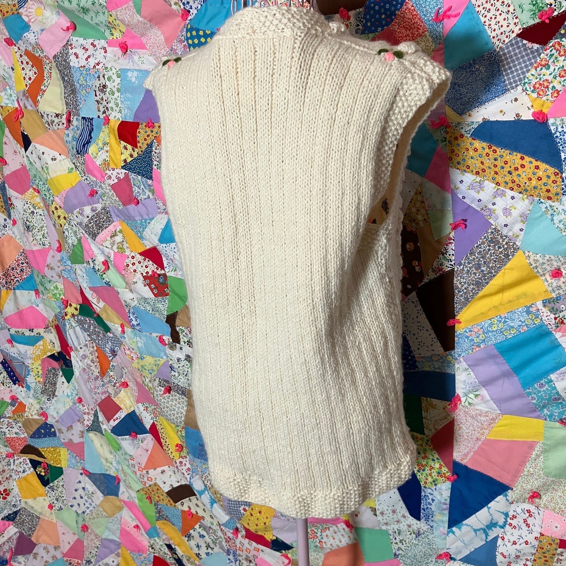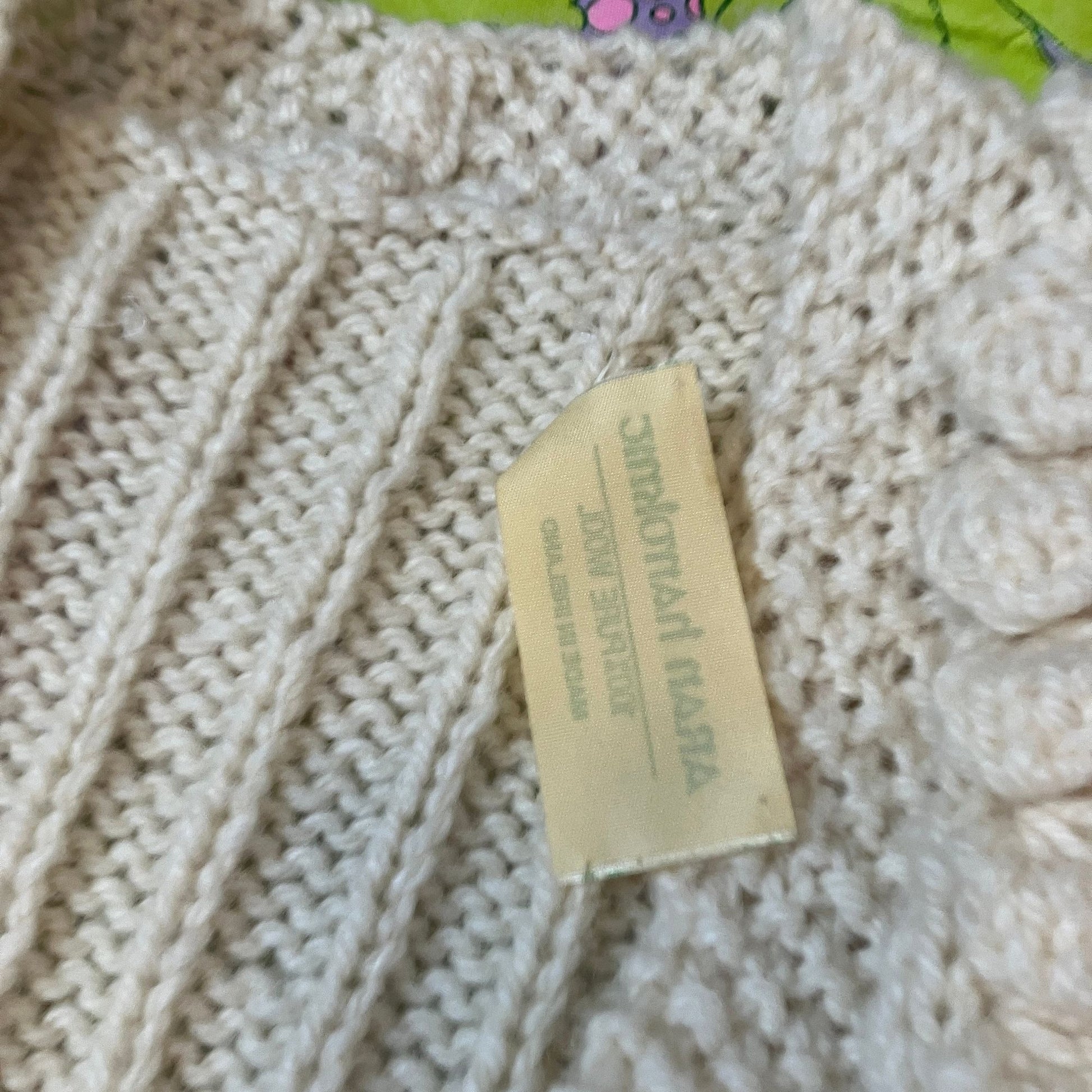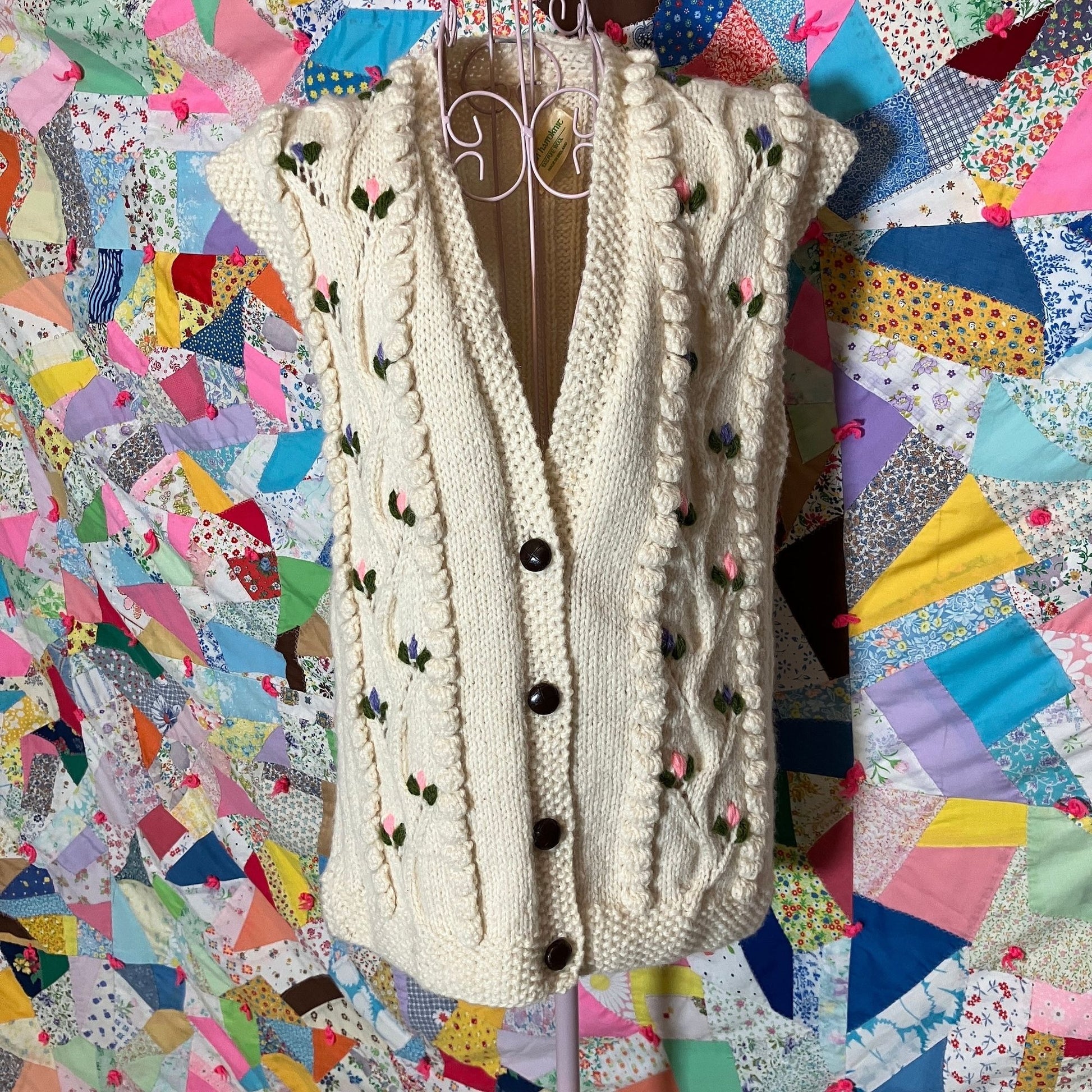 Vintage Aran Handknit 70s oat 100% wool cardigan sweater vest . Chunky cable knit / fisherman design with pink and purple flowers, v neck and a button front closure. Made in Ireland. In great vintage condition besides tag is only sewn on one corner, please see the photos