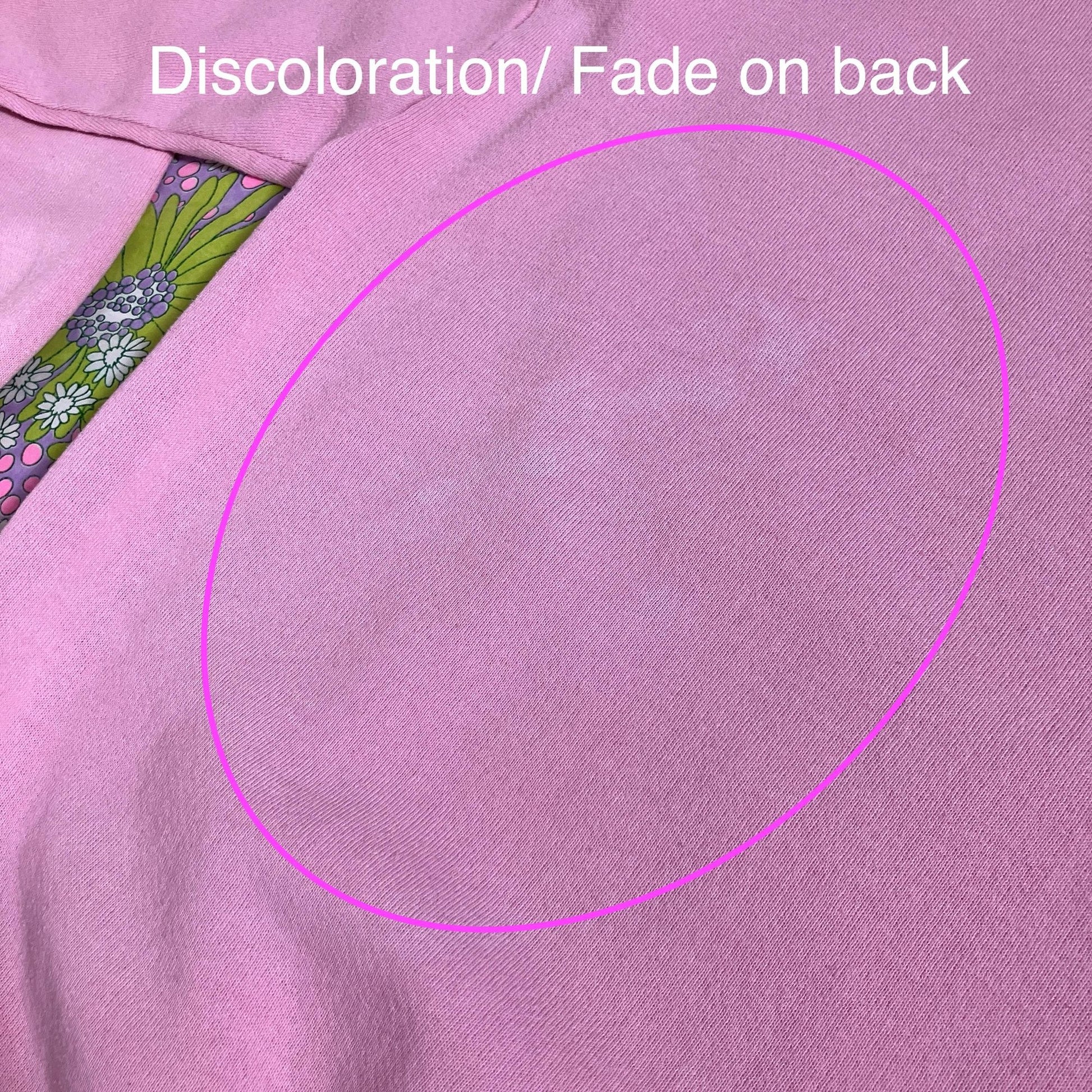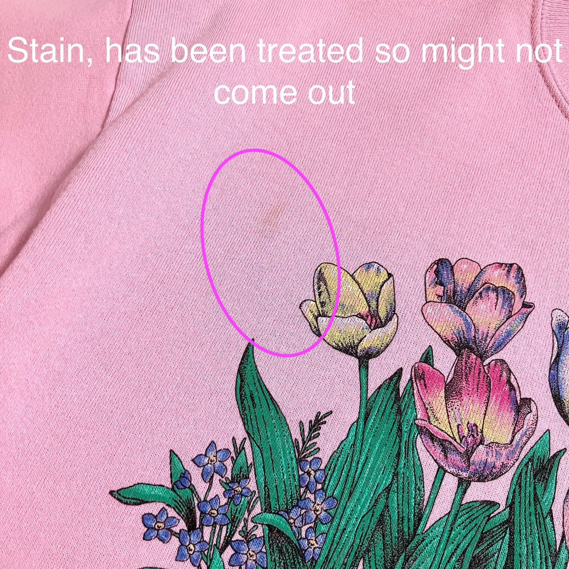 As is Jerzees 80s grandma sweatshirt. Cute detailed screen print of different shades of pink, blue, yellow and white tulip flowers. Crew neck and long sleeves. A somewhat faint stain on the front and bigger discoloration/fade on the back, please see the photos. Stain has been treated so might not come out. Would fit best a S - M, but please see the measurements to ensure a perfect fit. Original size is a L, made in the USA, and material is a poly cotton blend. Freshly laundered. Here to help if you have any questions.