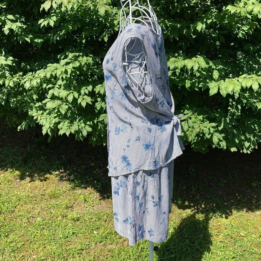 Vintage 90s top and short matching set. Cute iridescent buttons on the top, elastic waist on the shorts, gorgeous navy and blue floral and checkered print . Would best fit a S - M, but please see the measurements to ensure a perfect fit. Material is unknown, brand is Maggie Lawrence, and original size is a L. Freshly laundered. Here to help if you have any questions.