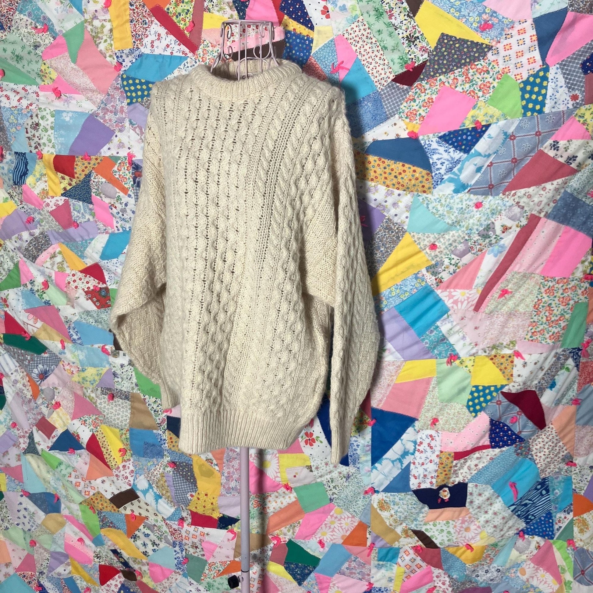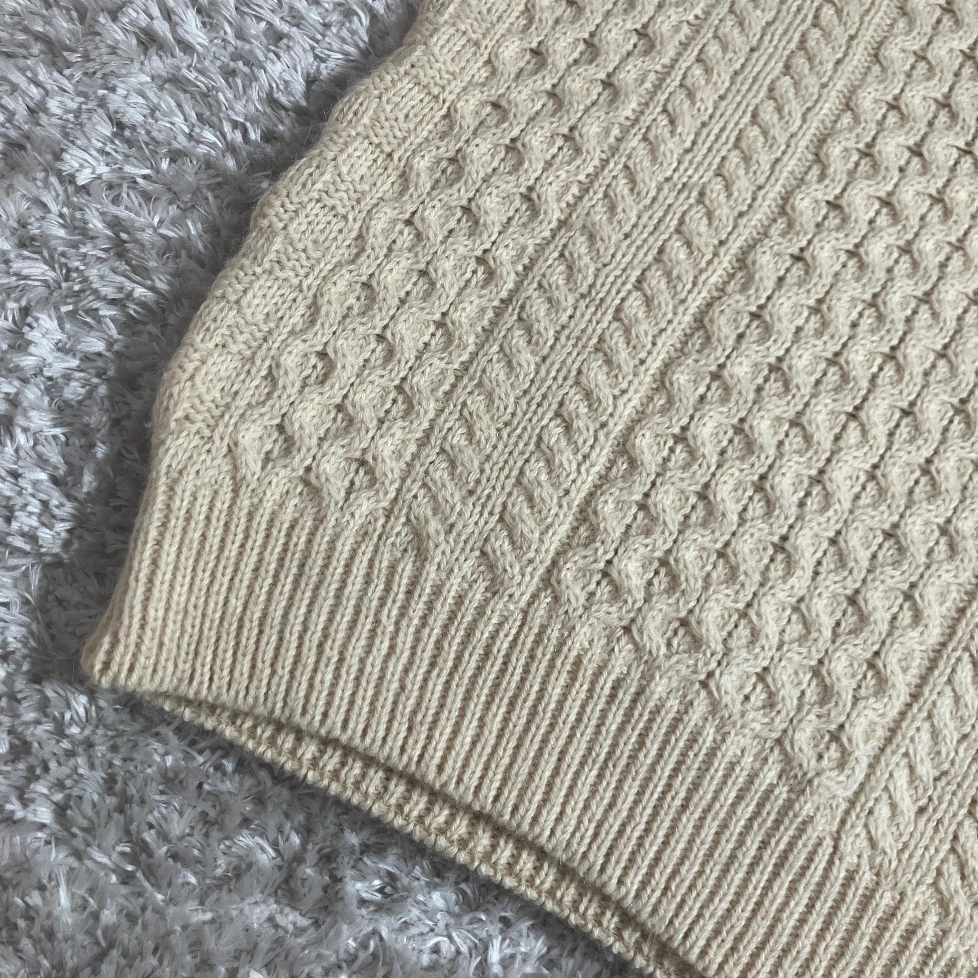 Cream Celtic Country wool and alpaca blend fisherman pull over sweater. Made in Ireland. Chunky heavyweight geometric cross hatch weave. Gorgeous cable knit texture, round neckline, longer silhouette, and pullover with no closure. Super soft. Would fit best a S-L, but please see the measurements to ensure a perfect fit.