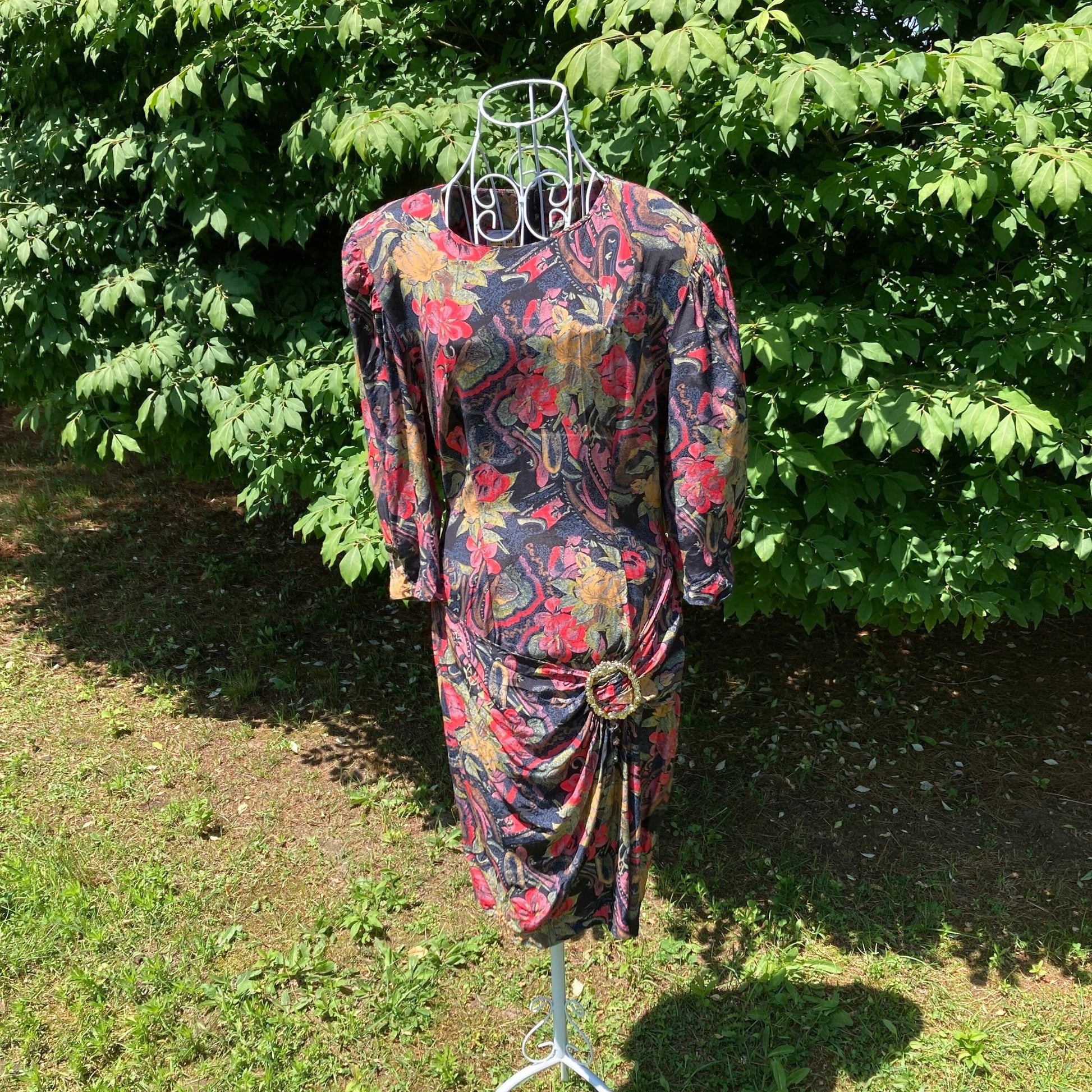 Lovely 80s paisley and floral print dress. Puff 3/4 sleeves, crew neckline, sheath silhouette, faux wrap skirt with gold tone accent, 3/4 length sleeve, and a below the knee length hem. Back zip closure . Pretty pink, red, black, and green colorway. Would best fit a S-M, but please see the measurements to ensure a perfect fit. Brand is How Sweet It Is, material is rayon, made in the USA, and tag size is 11. Unlined. Here to help if you have any questions.