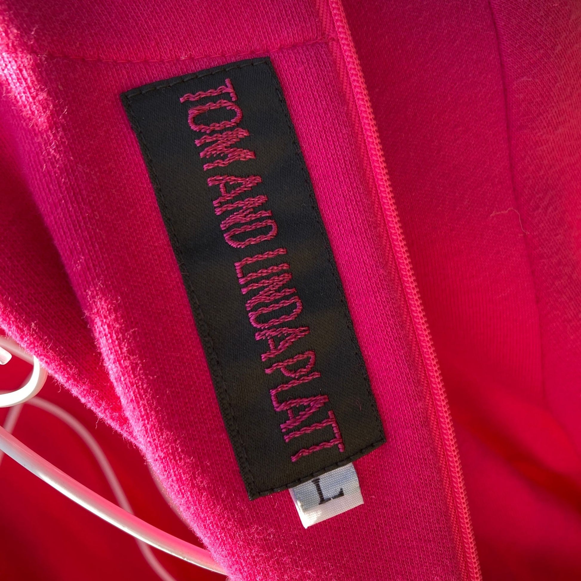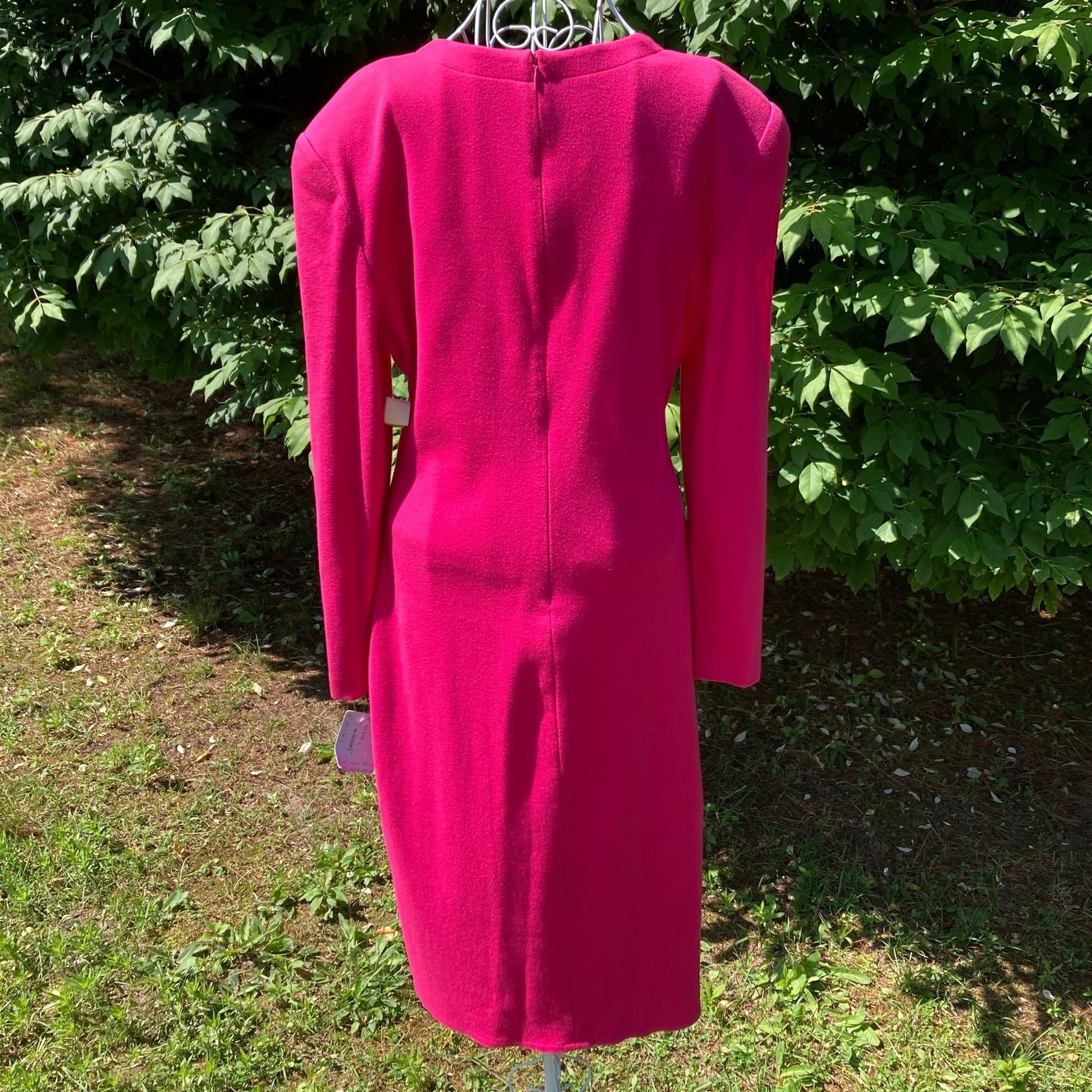 Bright pink 80s dress. Soft cotton blend material, asymmetrical v neckline, long sleeves, back zip, and snap closure, and a ruching detail on the bottom hem and hip . Has store hang tags intact. Would best fit a M, but please see the measurements to ensure a perfect fit. Brand is Tom and Linda Platt, material is unspecified but estimated to be a cotton blend, and tag size is a L. Has shoulder pads. Some light pilling, please see the photos. Here to help if you have any questions.