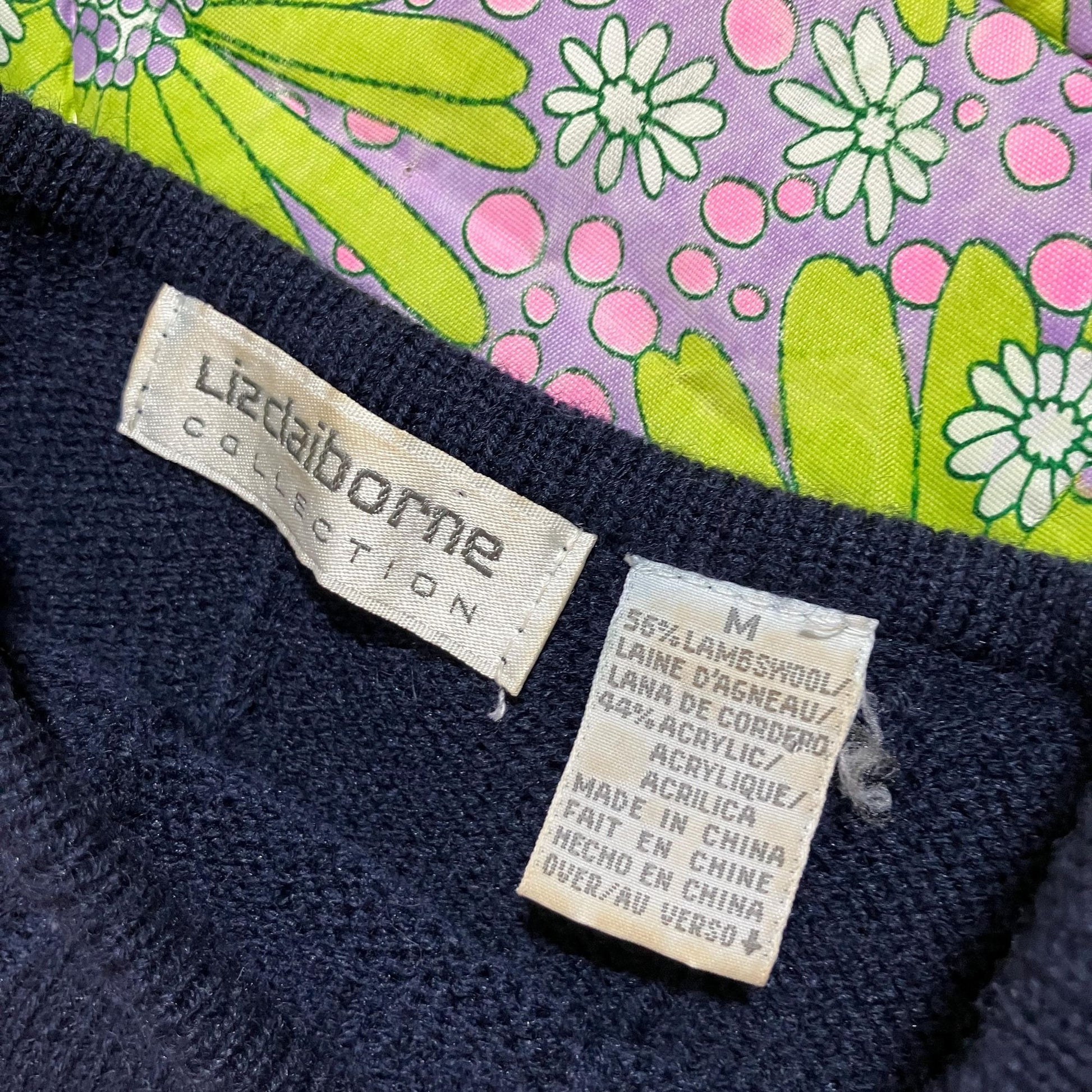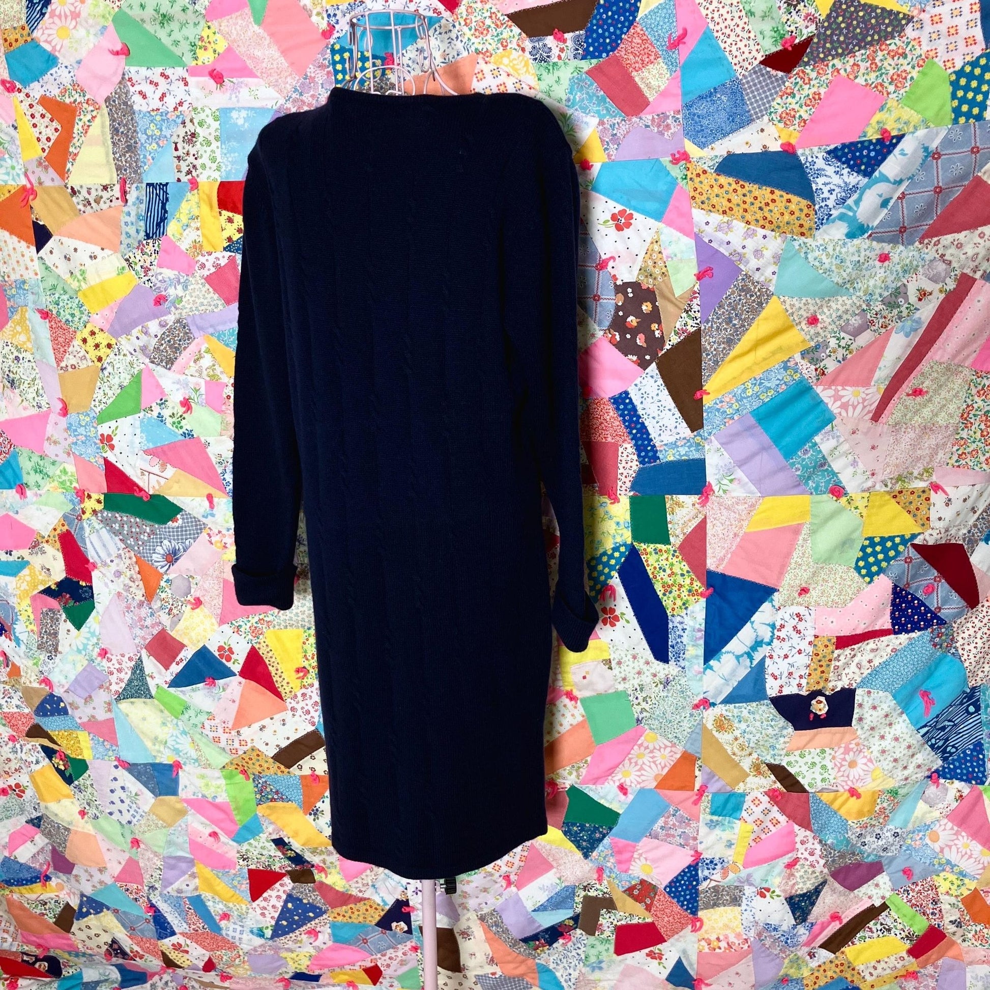 Vintage 80s sweater long sleeve dress. Navy blue wool and acrylic blend knit material, below the knee length hem, long sleeves, crew neckline, cable knit texture, and pullover with no closure. Has shoulder pads. Would best fit a M-L, but please see the measurements to ensure a perfect fit. Brand is Liz Claiborne Collection and original size is a 8. Some fuzziness and light pilling to the material, please see the photos. Here to help if you have any questions. Freshly laundered.