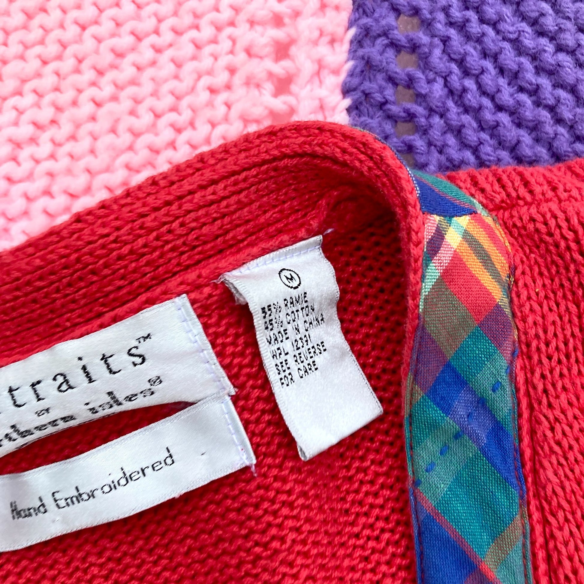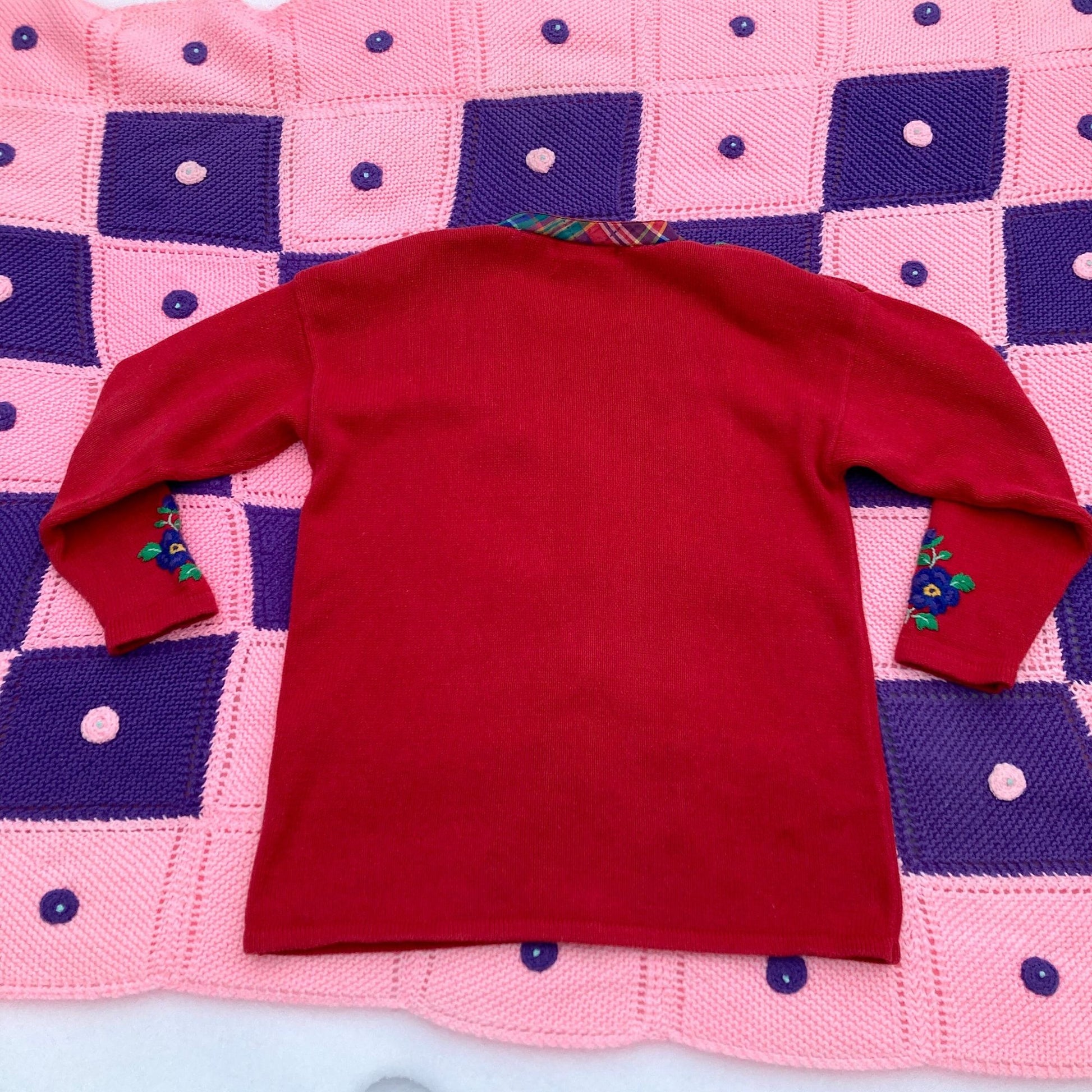 Vintage 80s red grandma cardigan knit sweater. Pretty floral embroidery in blue, yellow, green and white with a cute madras plaid trim on the button front closure. Deep V neckline and longer silhouette. Would fit best a M - L, but please see the measurements to ensure a perfect fit. Some pilling, please see the photos. Brand is Portraits by the Northern Isles, material is a cotton ramie blend, original size is a M, and hand embroidered. Here to help if you have any questions.