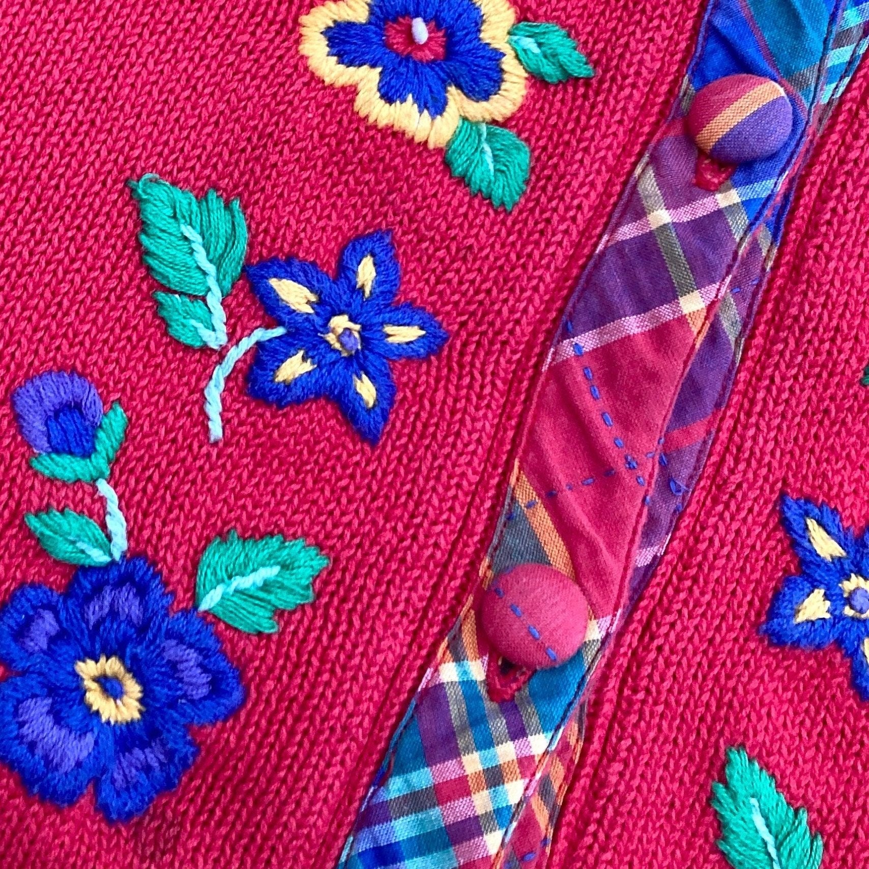 Vintage 80s grandma cardigan embroidered floral sweater | M - L| flowers 90s red blue yellow green plaid cotton cottage Northern Isles