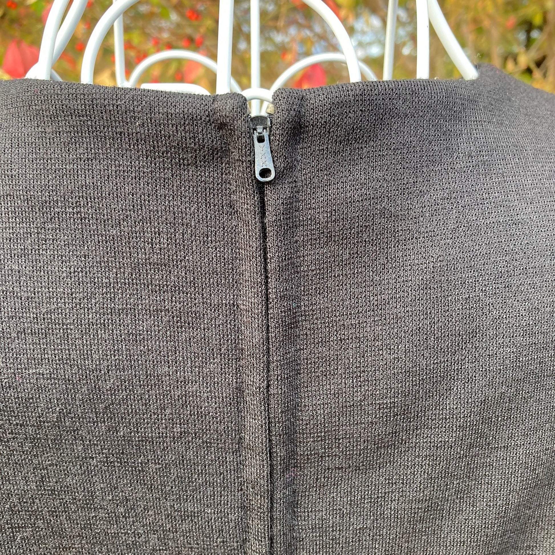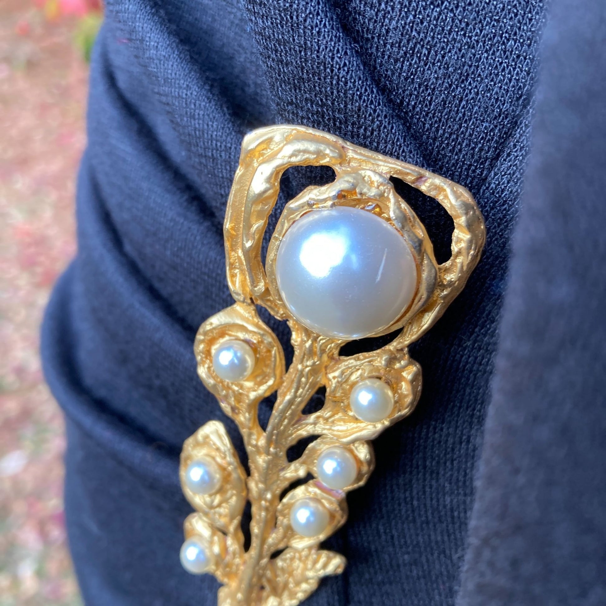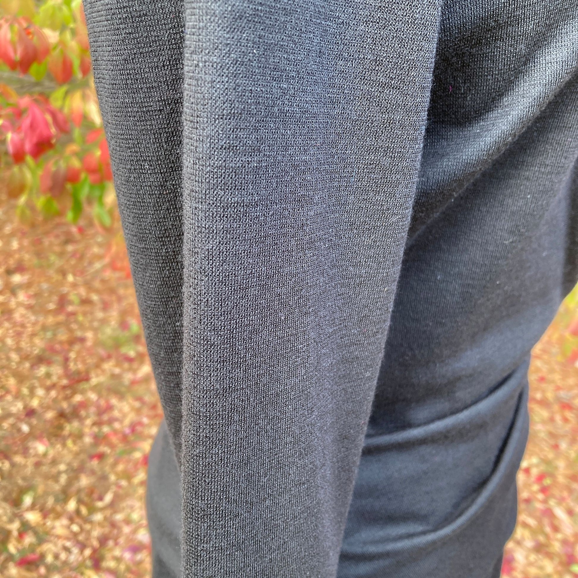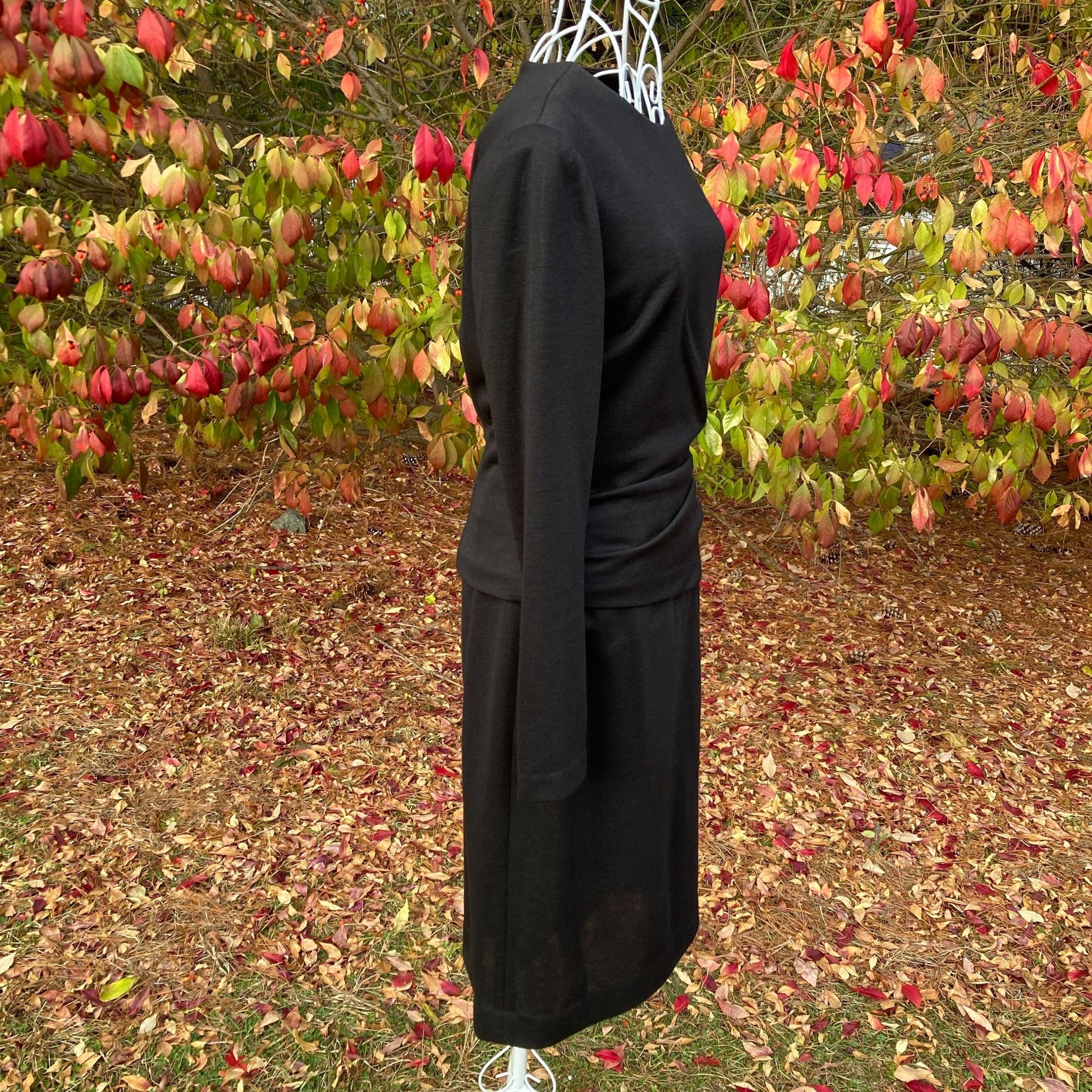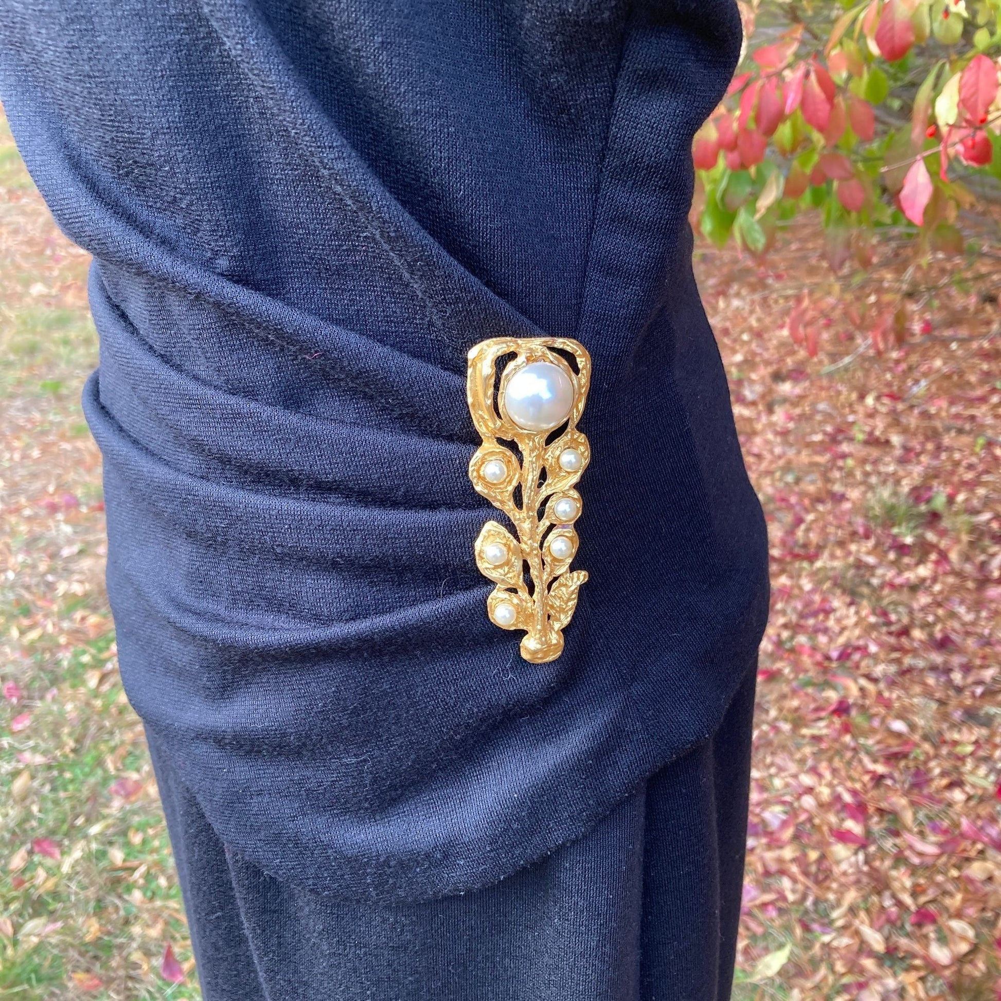 Vintage 80s black David Warren Saks Fifth Avenue dress. Gorgeous pearl and gold tone accent with ruching at the waist, crew neckline, long sleeves, shoulder pads, unlined, and a zip back closure. Original size and material are unknown. Would fit best a XS - S, but please check the measurements to ensure a perfect fit. Some pilling and general wear to the material some wear to the pearl accent as well, please see the photos. Here to help if you have any questions.