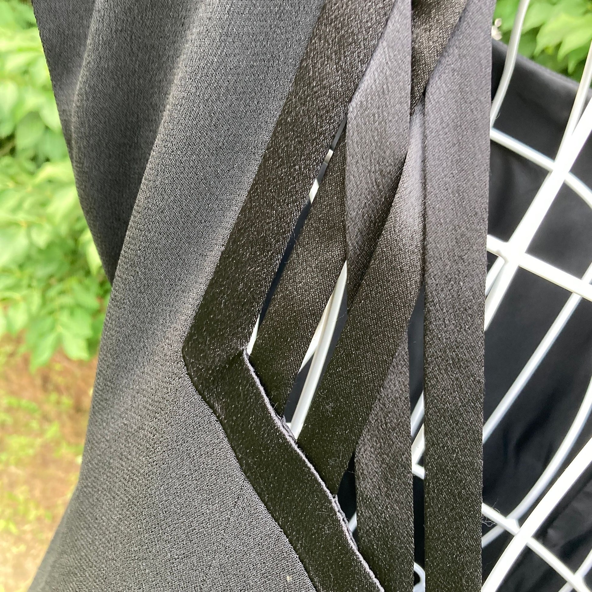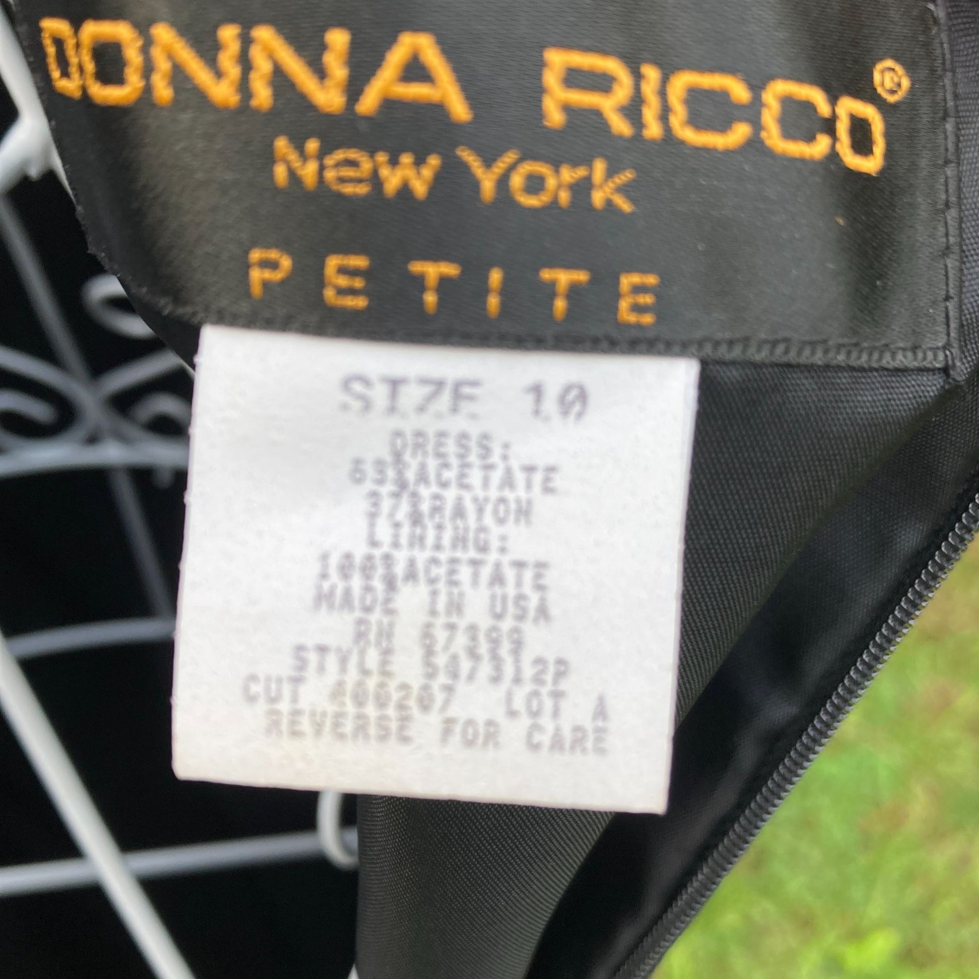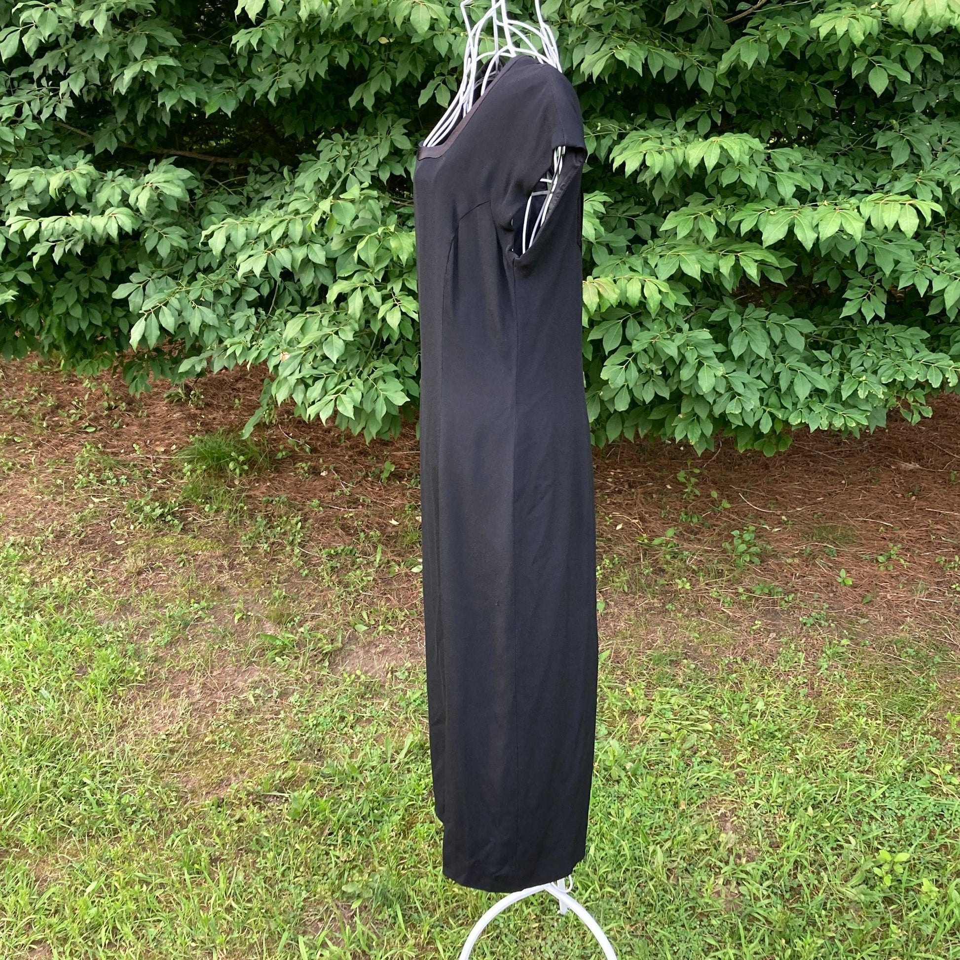 Vintage 80s 90s black formal dress. Short sleeves, square neckline, cute back detail, midi length hem, front slit, and a back zip closure. Brand is Donna Ricco Petite, original size is a
