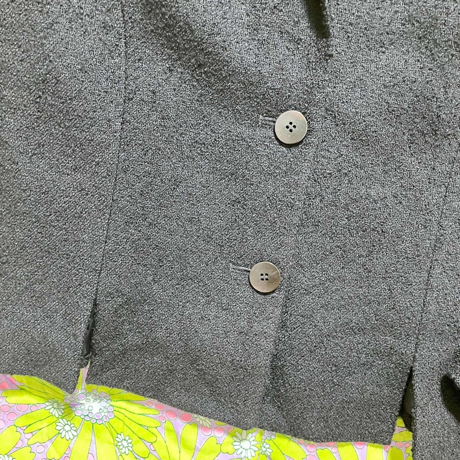 Tag size is unknown and material is a wool and nylon blend with an acetate lining. Some light wear to the material, please see the photos. Here to help if you have any questions.