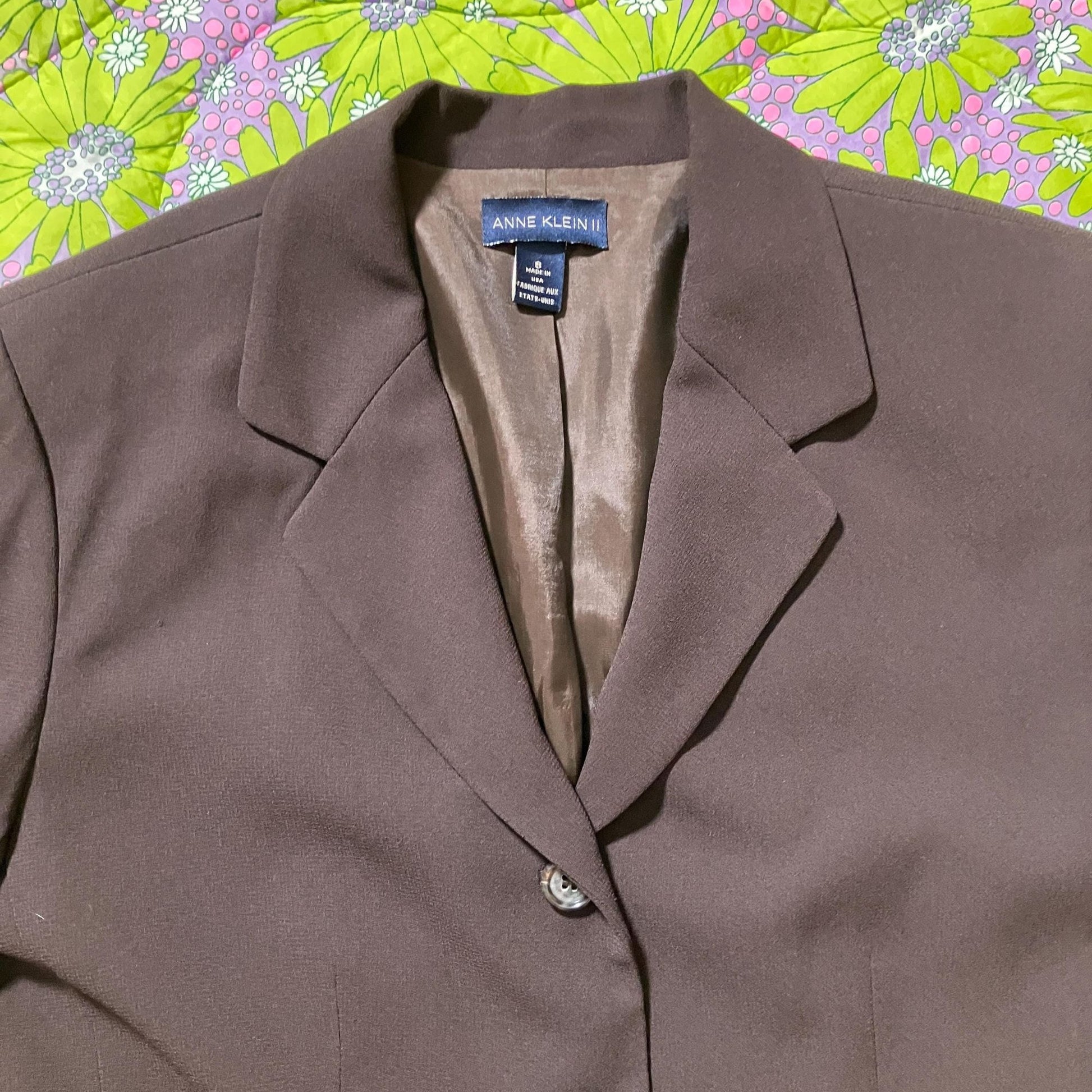 Vintage 90s Anne Klein II chocolate brown blazer. Synthetic material, longer silhouette, padded shoulders, fully lined, long sleeves and a collared neckline. Would fit best a S - M, but please see the measurements to ensure a perfect fit.
