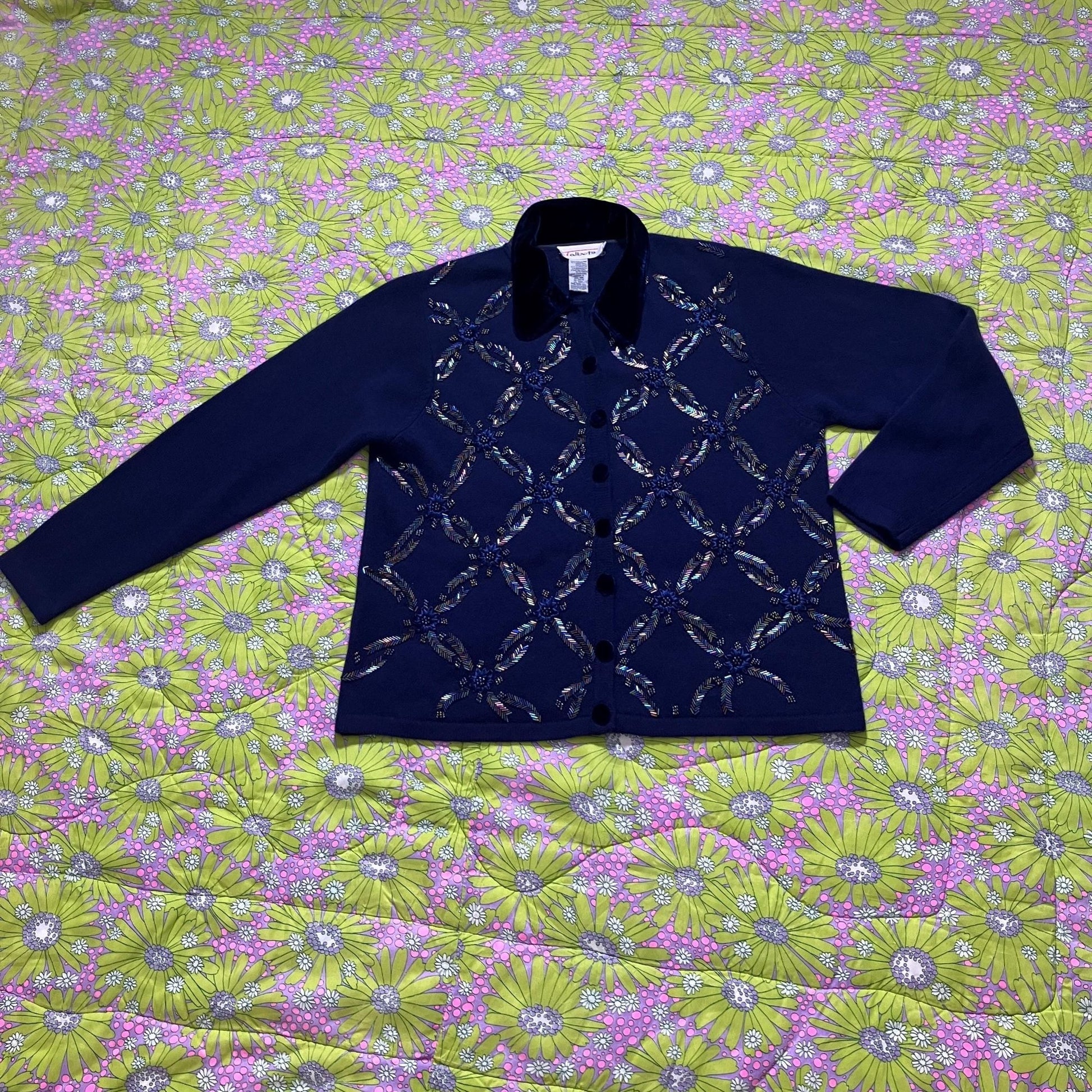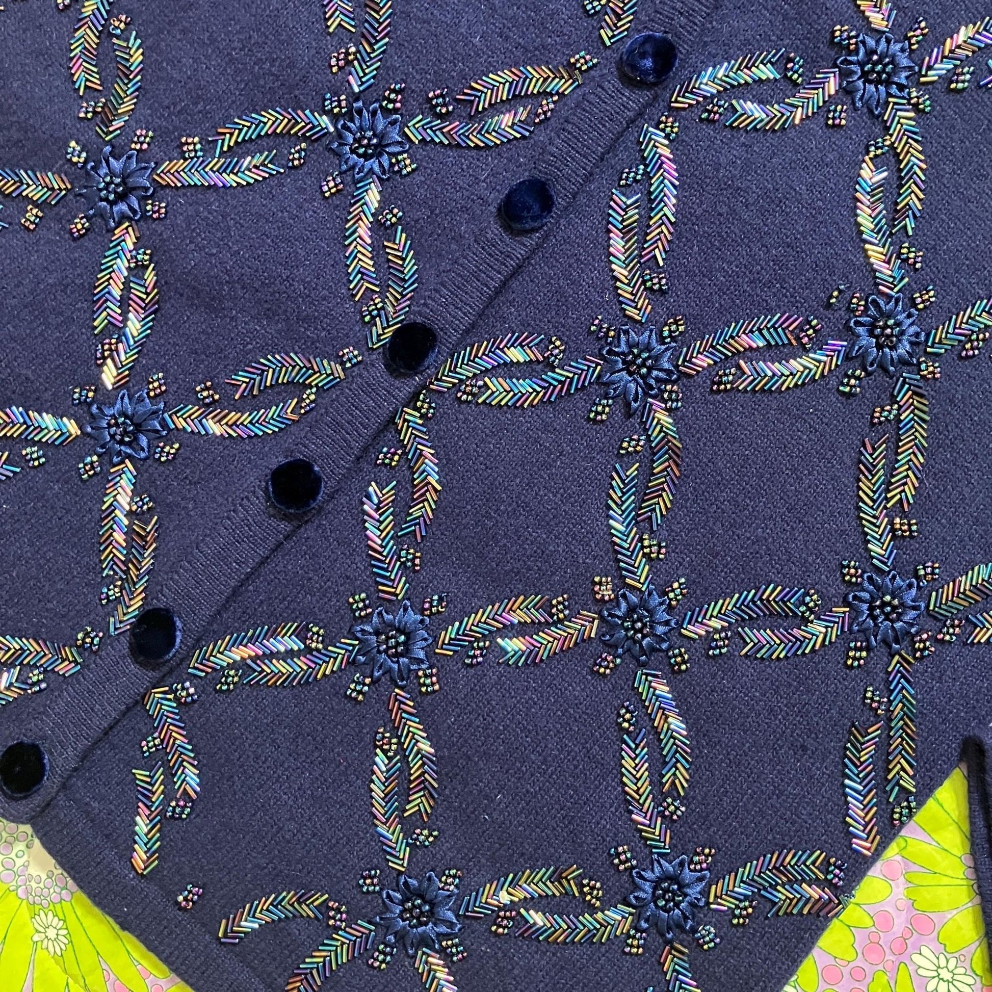Vintage 90s Talbots cardigan floral knit sweater ribbon beading flowers wool angora blend iridescent