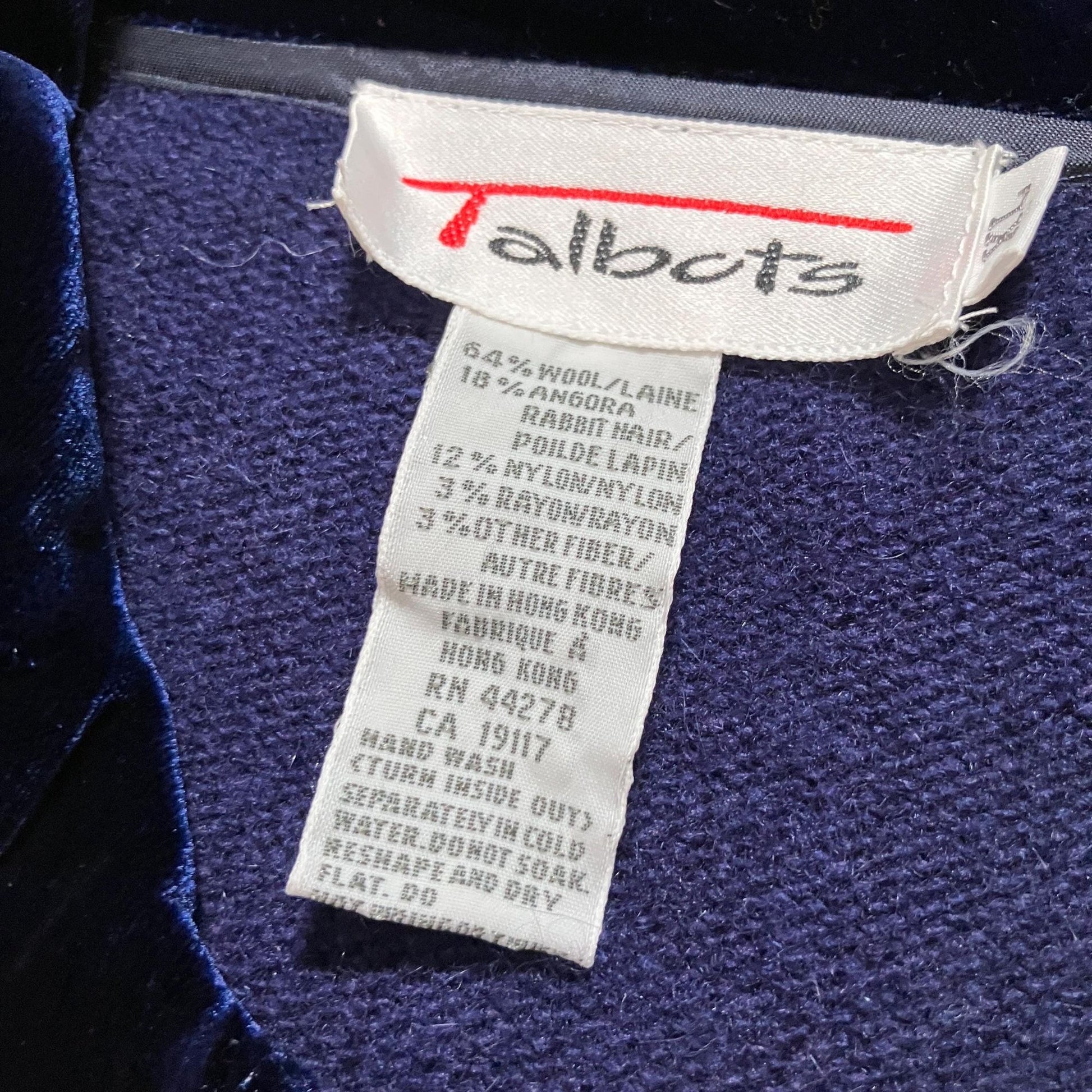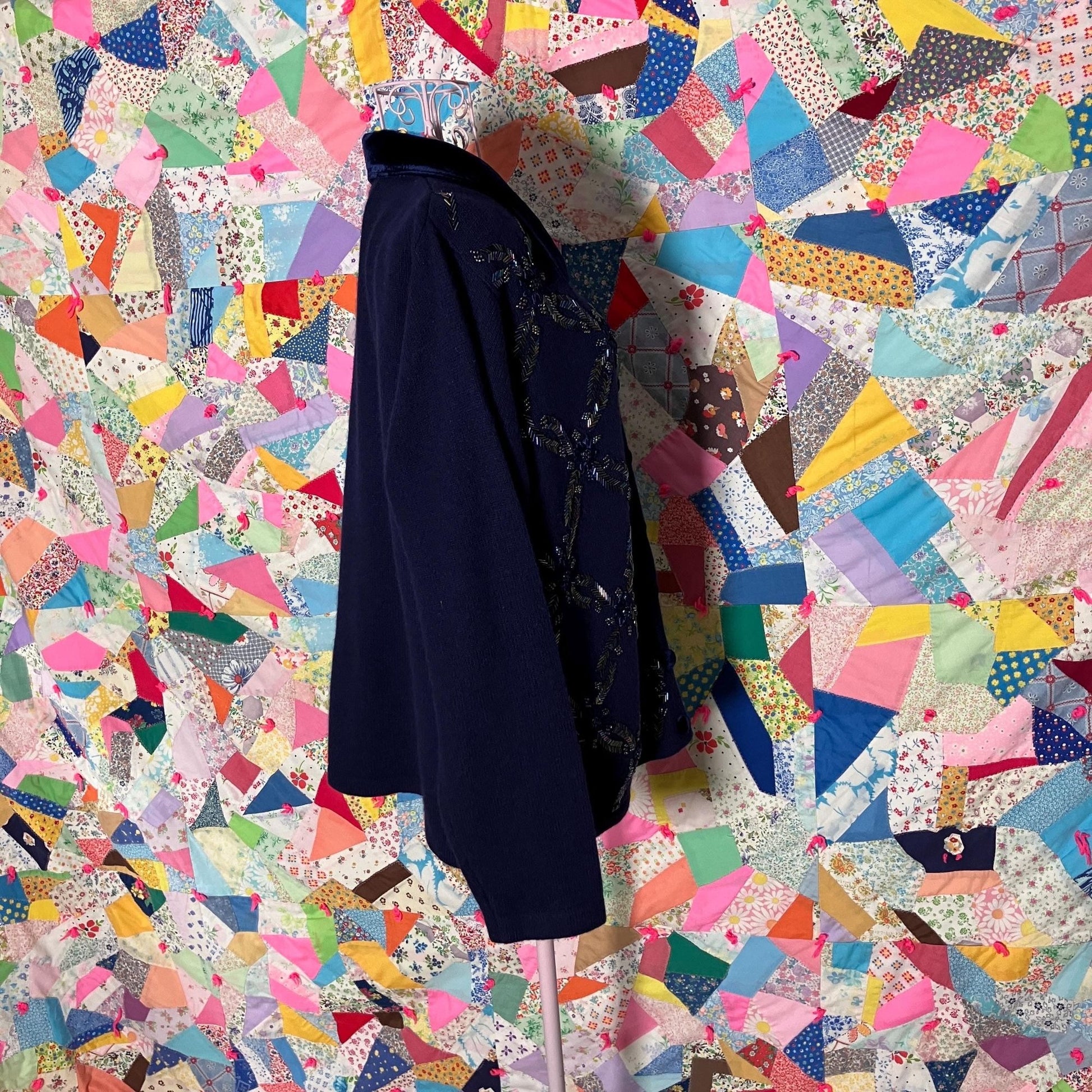 Vintage 90s Talbots deep blue grandma cardigan wool and angora blend sweater. pretty floral and embroidery with ribbons and shiny iridescent beads.. Soft velvet collar and buttons . Would fit best a M - XL, but please see the measurements to ensure a perfect fit. Some light pilling, please see the photos. Material is a wool, angora, nylon, and rayon blend and original size is an XL. Here to help if you have any questions .