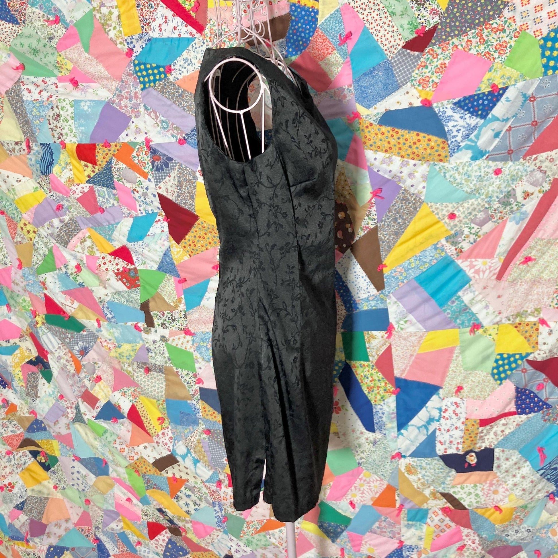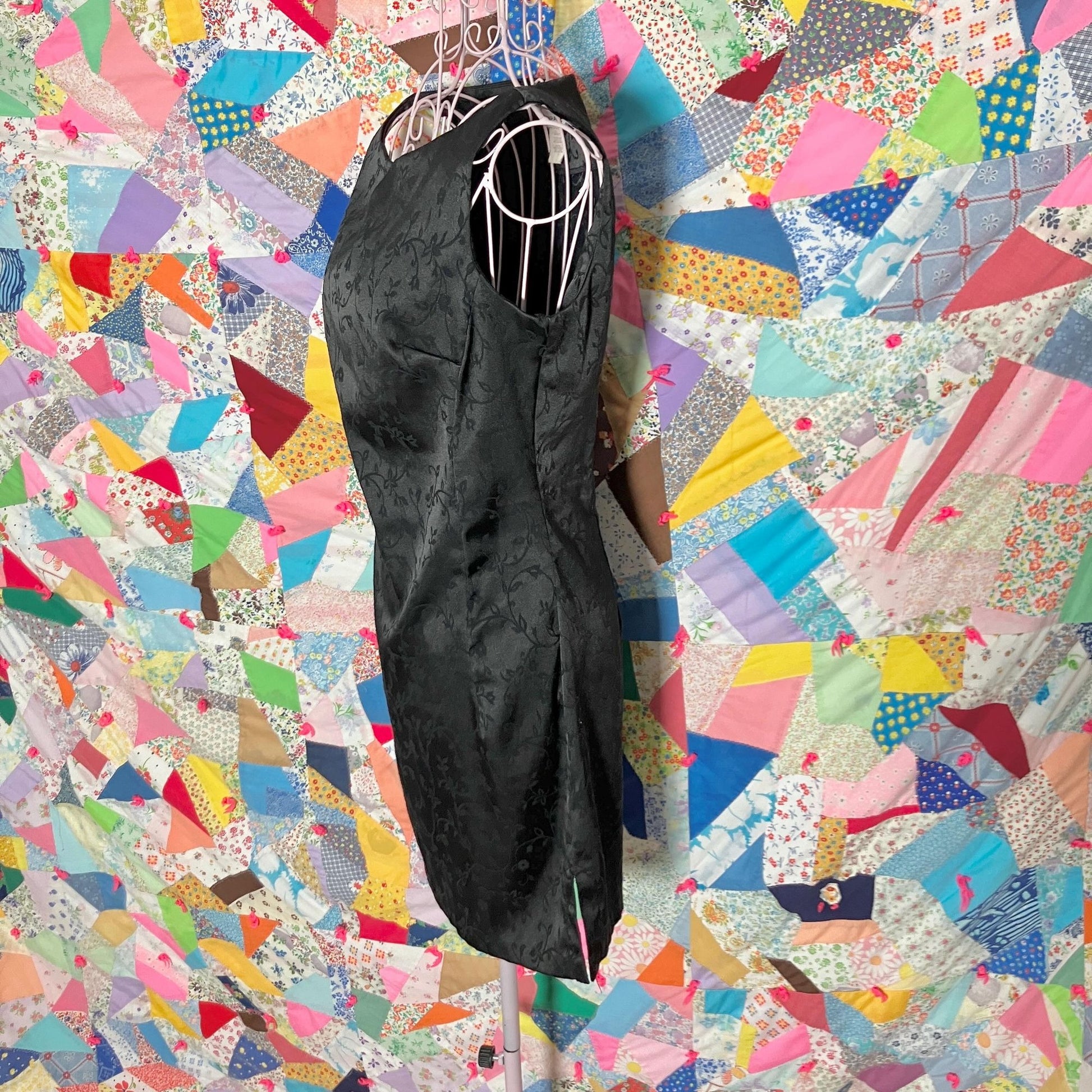 Vintage 90s y2k little black dress. Sheath silhouette, split v neckline, sleeveless, monochromatic jacquard floral print , and a mini length hem. Would best fit a XS-S, but please see the measurements to ensure a perfect fit. Brand is Rampage, tagged a size 3, and material is polyester and spandex.