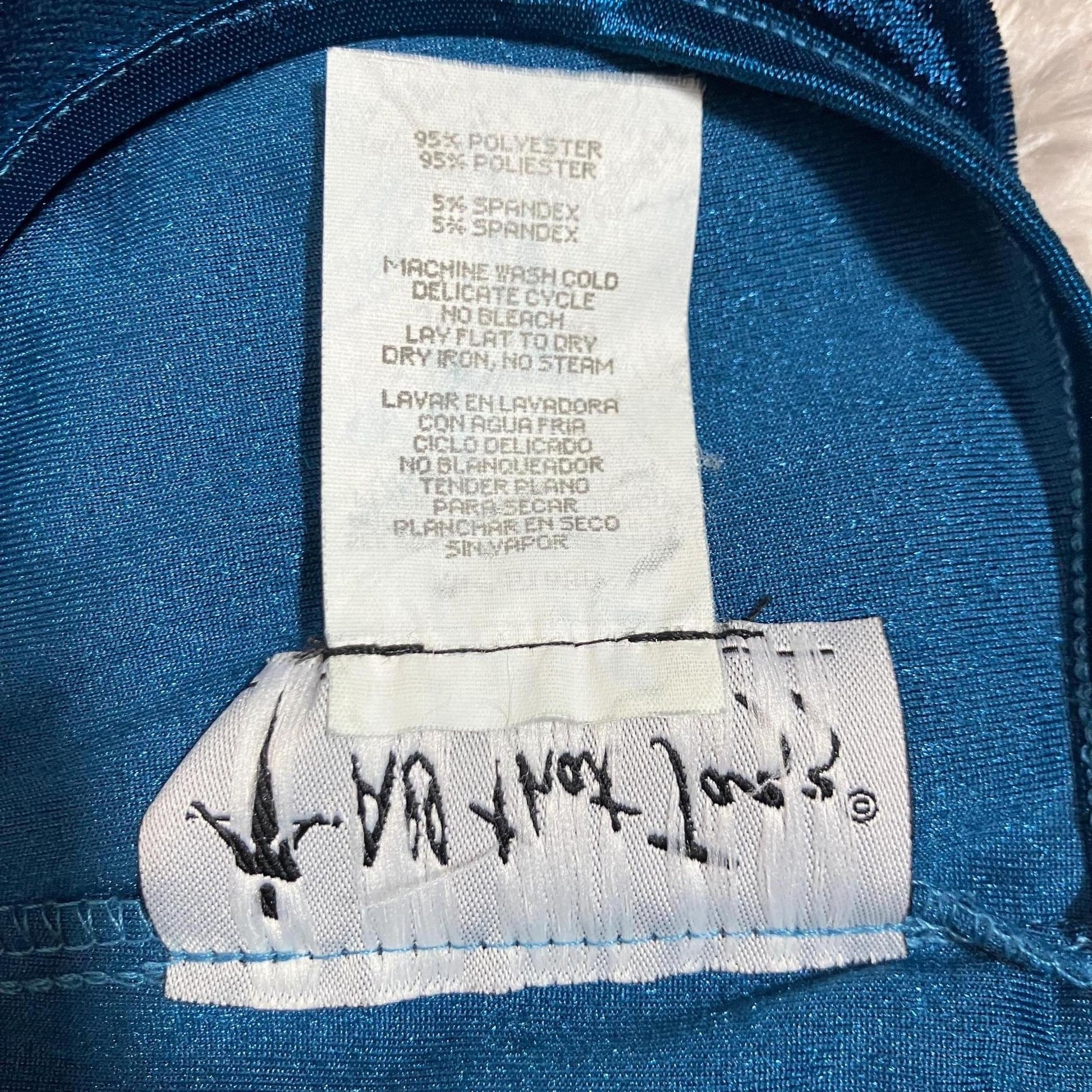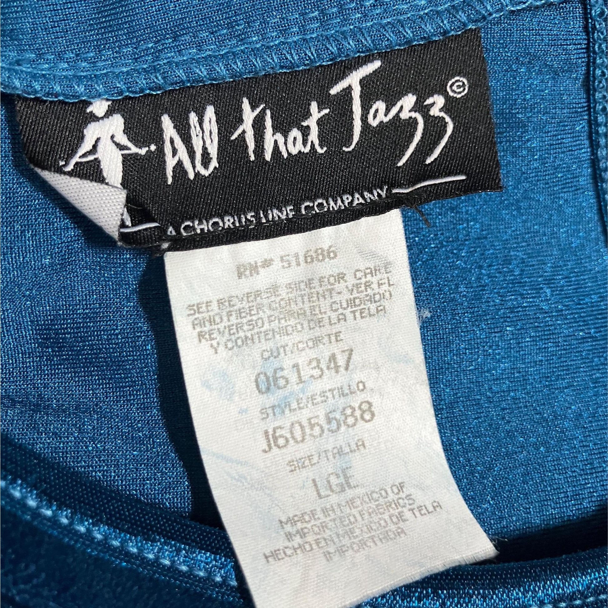 Brand is All That Jazz, material is a polyester and spandex blend and original size is a L. Some light wear to the material, please see the photos.