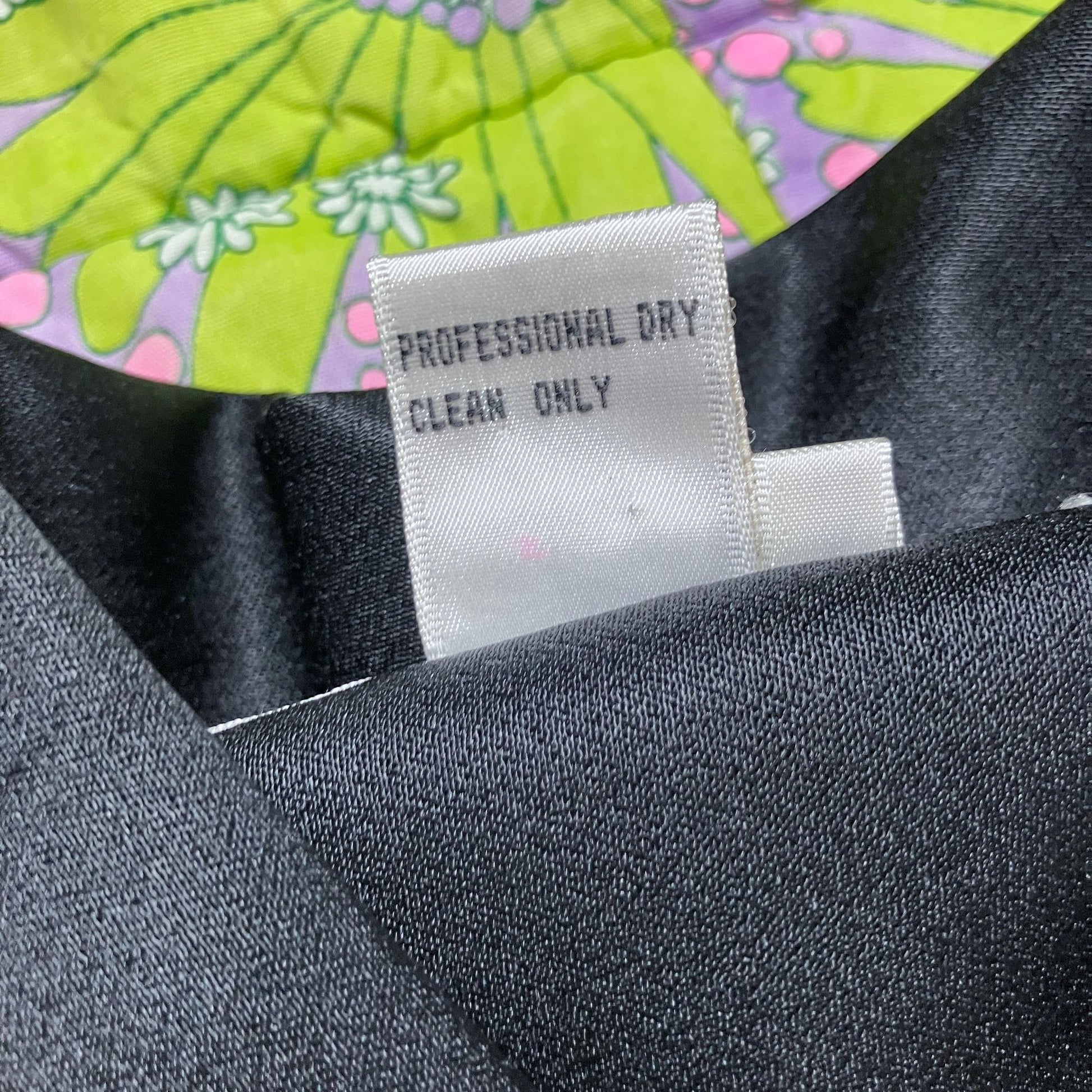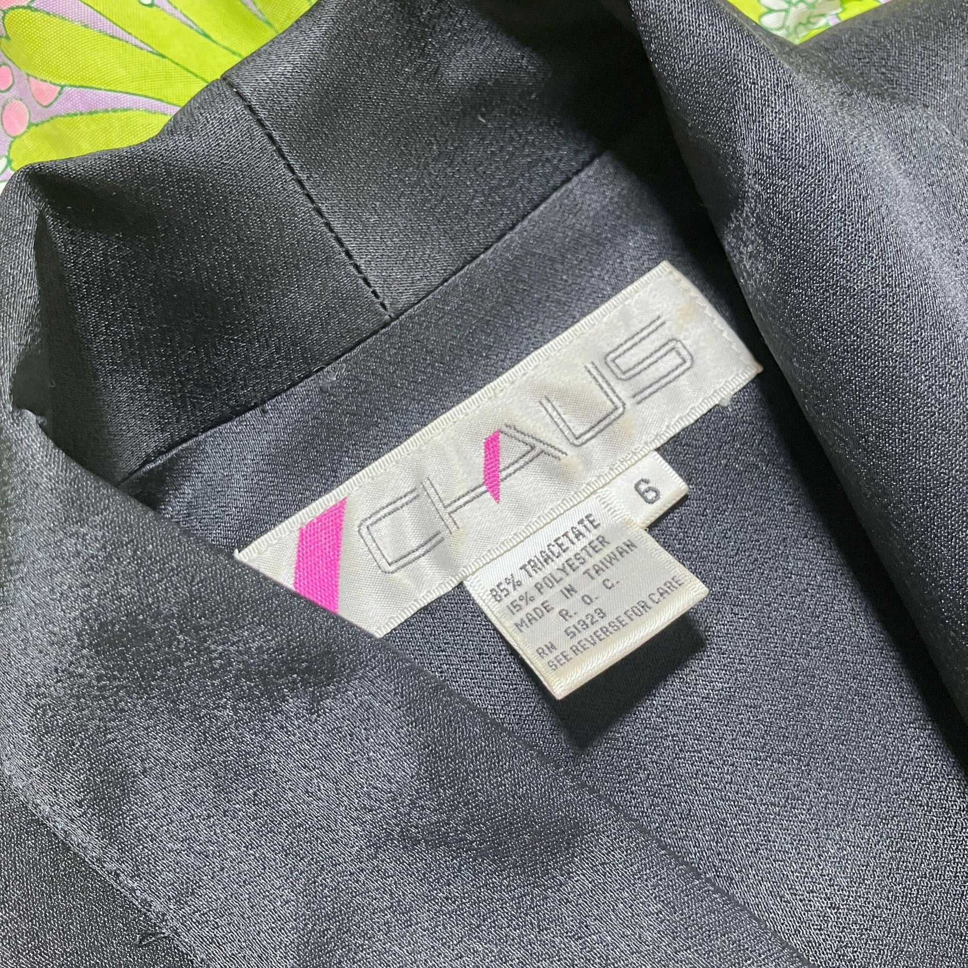 Original size is a 6, material is triacetate and polyester and and brand is Chaus. Freshly laundered. Here to help if you have any questions.