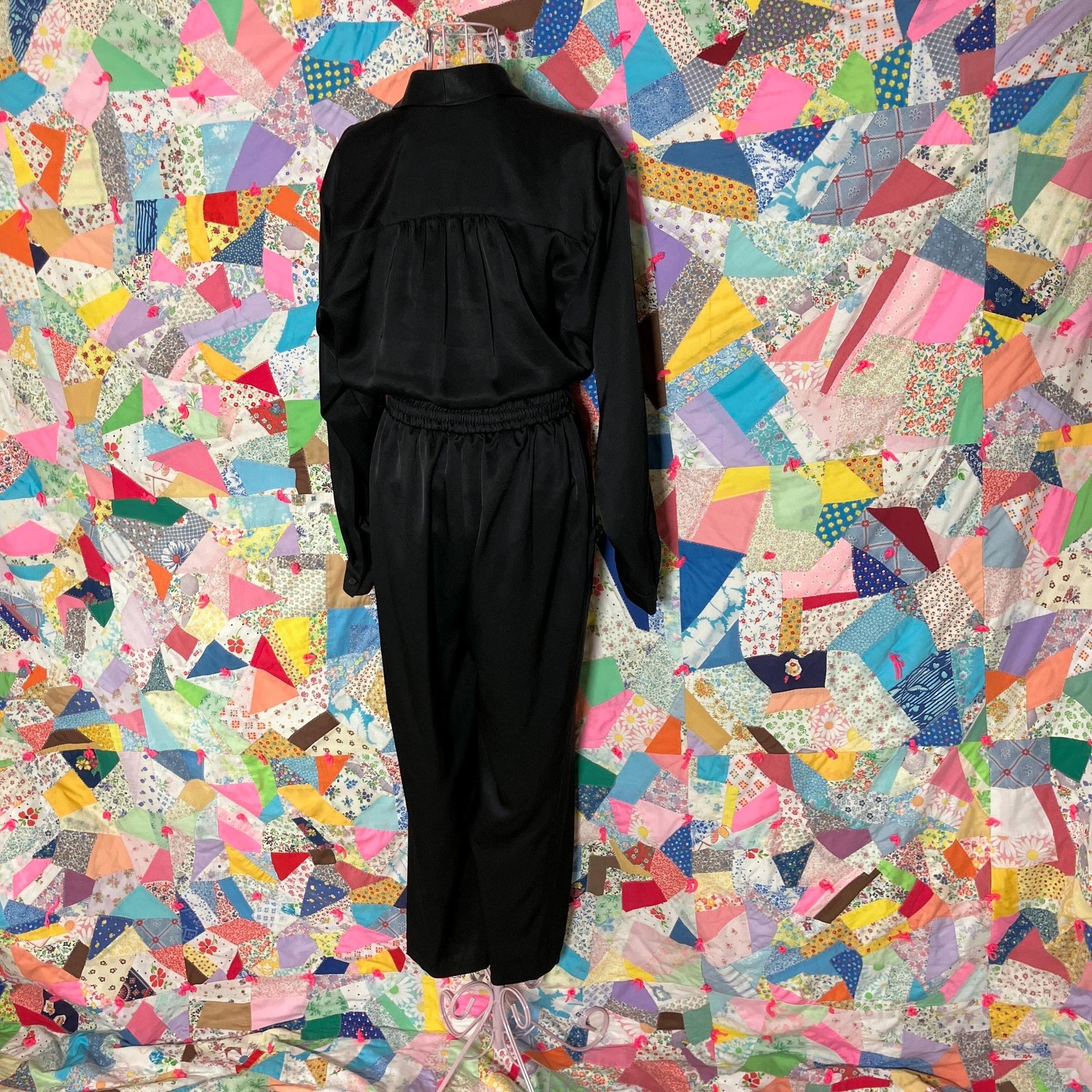 Long sleeves, tapered leg pants, collared neckline, elastic waist band, and a front button closure. Would best fit a S-M, but please see the measurements to ensure a perfect fit. Short or cropped inseam at 26.5 in.
